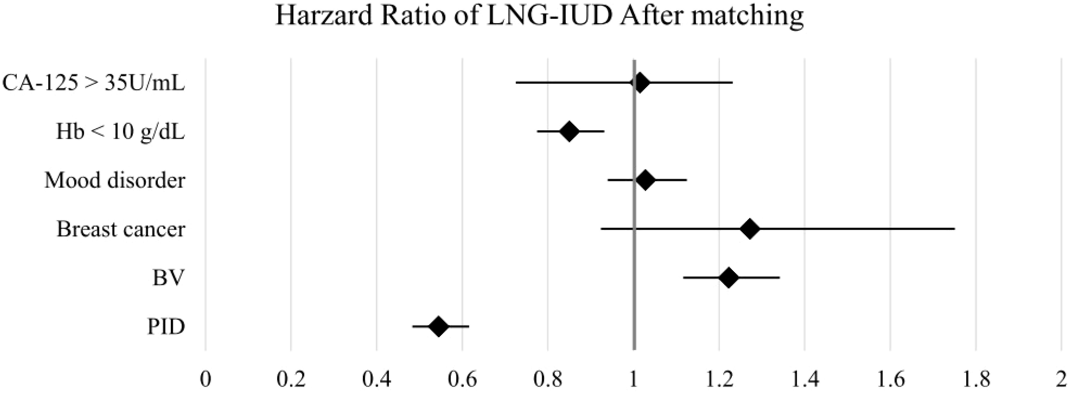 Figure 3. Forest plots of outcomes after matching. BV, bacterial vaginosis; CA-125, cancer antigen 125; Hb, hemoglobin; LNG-IUD, levonorgestrel intrauterine device; PID, pelvic inflammatory disease; PSM, propensity score matching.