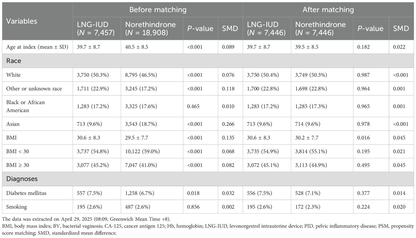 Prior to PSM, the LNG-IUD group comprised 7,457 individuals, while the oral norethindrone group included 18,908 individuals. As shown in Table 1, after PSM, both groups were matched 1:1, resulting in 7,446 patients in each group for subsequent analyses. The average age across both cohorts was approximately 40 years, and the mean BMI was around 30. In terms of race, the majority of patients were white, accounting for 50.3% in the LNG-IUD group and 46.5% in the norethindrone group. Regarding comorbidities, approximately 7% of patients were diagnosed with diabetes mellitus and 2.6% reported tobacco use. The matching process was considered successful as indicated by SMD below 0.1 for all matched variables, as shown in Table 1.