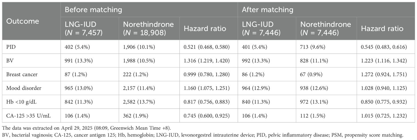 Results: After PSM, the LNG-IUD group showed a significantly lower risk of PID (hazard ratio (HR) 0.545; 95% confidence interval (CI) 0.483–0.616) and Hb <10 g/dL (HR 0.850; 95% CI 0.775–0.932) compared with the oral norethindrone group. In contrast, the risk of BV was significantly higher in the LNG-IUD group (HR 1.223; 95% CI 1.116–1.342). No significant differences were observed between the two groups regarding associated breast cancer, mood disorder, or CA-125 ≥ 35 U/mL.