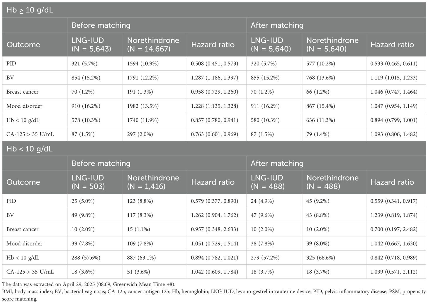 The baseline characteristics of patients stratified by Hb ≥10 g/dL or <10 g/dL are presented in Supplementary Tables S2, S3. The total number of patients in these subgroups was smaller than in the overall cohort because hemoglobin data were not available for all individuals. After PSM, the number of patients in both the LNG-IUD and oral norethindrone groups was 5,640 for the Hb ≥10 g/dL subgroup and 488 for the Hb <10 g/dL subgroup, respectively, as shown in Table 3. In the Hb ≥10 g/dL subgroup, the LNG-IUD group showed a significantly lower risk of PID compared with the norethindrone group (HR 0.533; 95% CI 0.465–0.611). However, the risk of BV was significantly higher in the LNG-IUD group (HR 1.119; 95% CI 1.015–1.233). No statistically significant differences were observed between the two groups for breast cancer, mood disorder, or CA-125 ≥35 U/mL. In the Hb <10 g/dL subgroup, which had a smaller sample size, the LNG-IUD group similarly exhibited a significantly reduced risk of PID (HR 0.559; 95% CI 0.341–0.917). Although BV showed a similar trend toward a higher incidence in the LNG-IUD group, the difference did not reach statistical significance (HR 1.239; 95% CI 0.819–1.874). For all other outcomes, including breast cancer, mood disorder, and elevated CA-125 levels, no statistically significant differences were observed between the treatment groups.