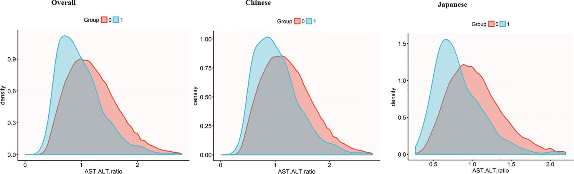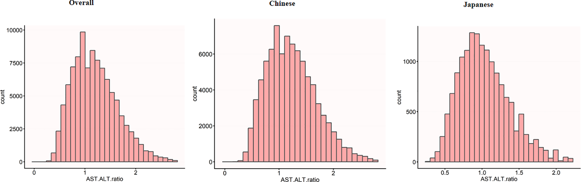 In summary, we hypothesize that the inverse association between the AST/ALT ratio and diabetes will be consistent across both Chinese and Japanese cohorts, supporting its role as a robust pan-Asian biomarker, and BMI will mediate this association, which may vary between these two cohorts.