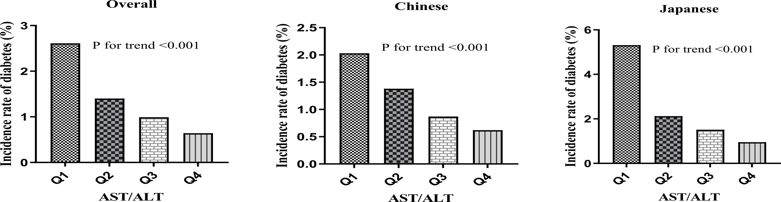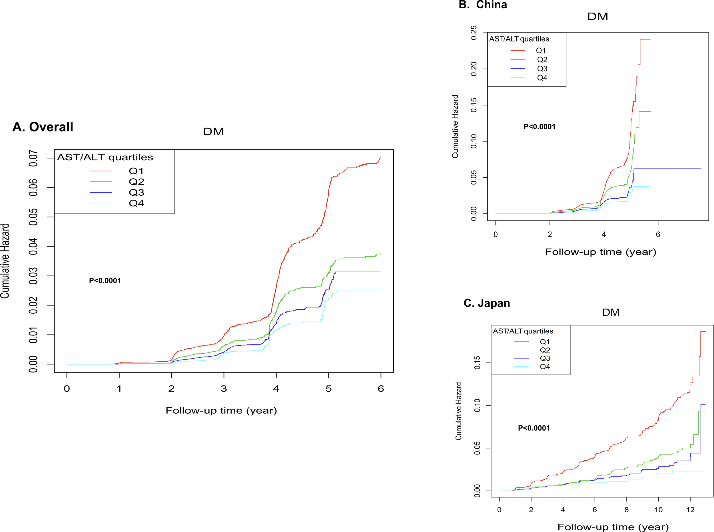 Baseline characteristics were analyzed across AST/ALT quartiles (Q1:<0.8666; Q2:0.8666-1.1481; Q3:1.1481-1.4749; Q4: ≥1.4749) using appropriate statistical methods. Continuous variables underwent comprehensive statistical characterization, with normally distributed data represented by mean and standard deviation, while skewed distributions were described using median and interquartile range statistics. Categorical variables were systematically documented through frequency and percentage analyses. Statistical comparisons used appropriate analytical techniques, utilizing one-way ANOVA for parametric continuous variables, the Kruskal-Wallis test for non-parametric distributions, and chi-square tests for categorical data. The survival analysis component implemented the Kaplan-Meier method, with the log-rank test applied to generate comparative analyses of cumulative hazard across distinct AST/ALT groupings. To aligns the time windows for the Chinese and Japanese cohorts, we have defined the survival status of participants in the Overall database, who experienced a diabetes event after 6 years of follow-up, as not having experienced the outcome event. For other participants, their survival status remains unadjusted. We have standardized the follow-up duration for the overall databases to 6 years, where follow-up times exceeding 6 years are categorized as 6 years, and those within 6 years retain their original follow-up times without adjustments.
