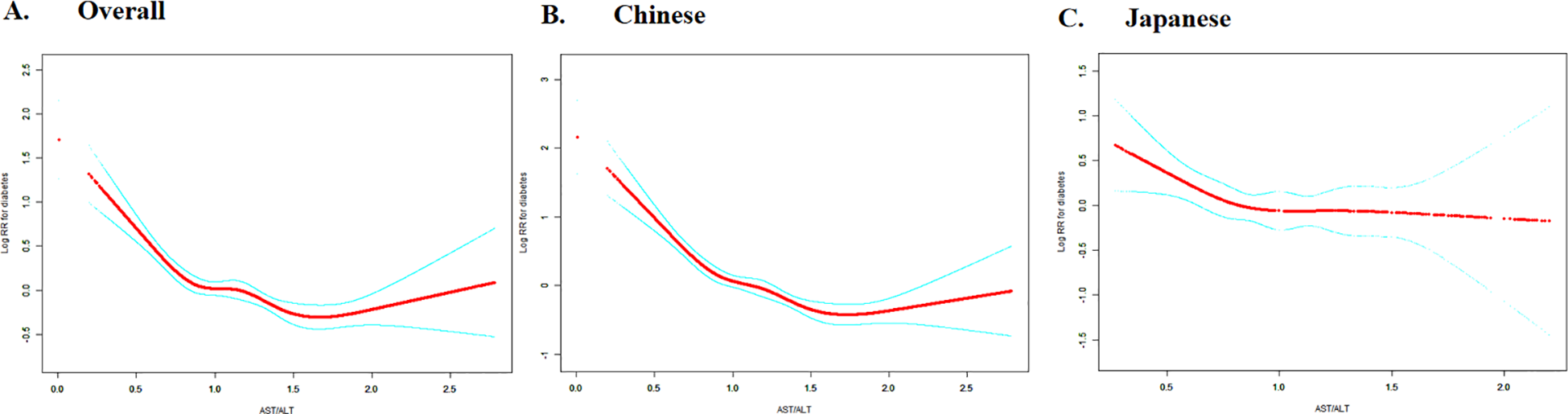 The Chinese and Japanese populations possess distinct dietary habits, and environmental exposures, which offer a unique vantage-point to explore potential ethnic disparities in the relationship between the AST/ALT ratio and diabetes. Despite these differences, these two populations share some commonalities. For instance, compared to Western populations, they generally have lower obesity rates. However, they display significant variations in the prevalence of diabetes and the profiles of associated risk factors (36). Delving into these differences can offer valuable perspectives on the underlying mechanisms, and further contribute to the refinement of risk stratification methods, enabling more targeted and effective prevention and management strategies.