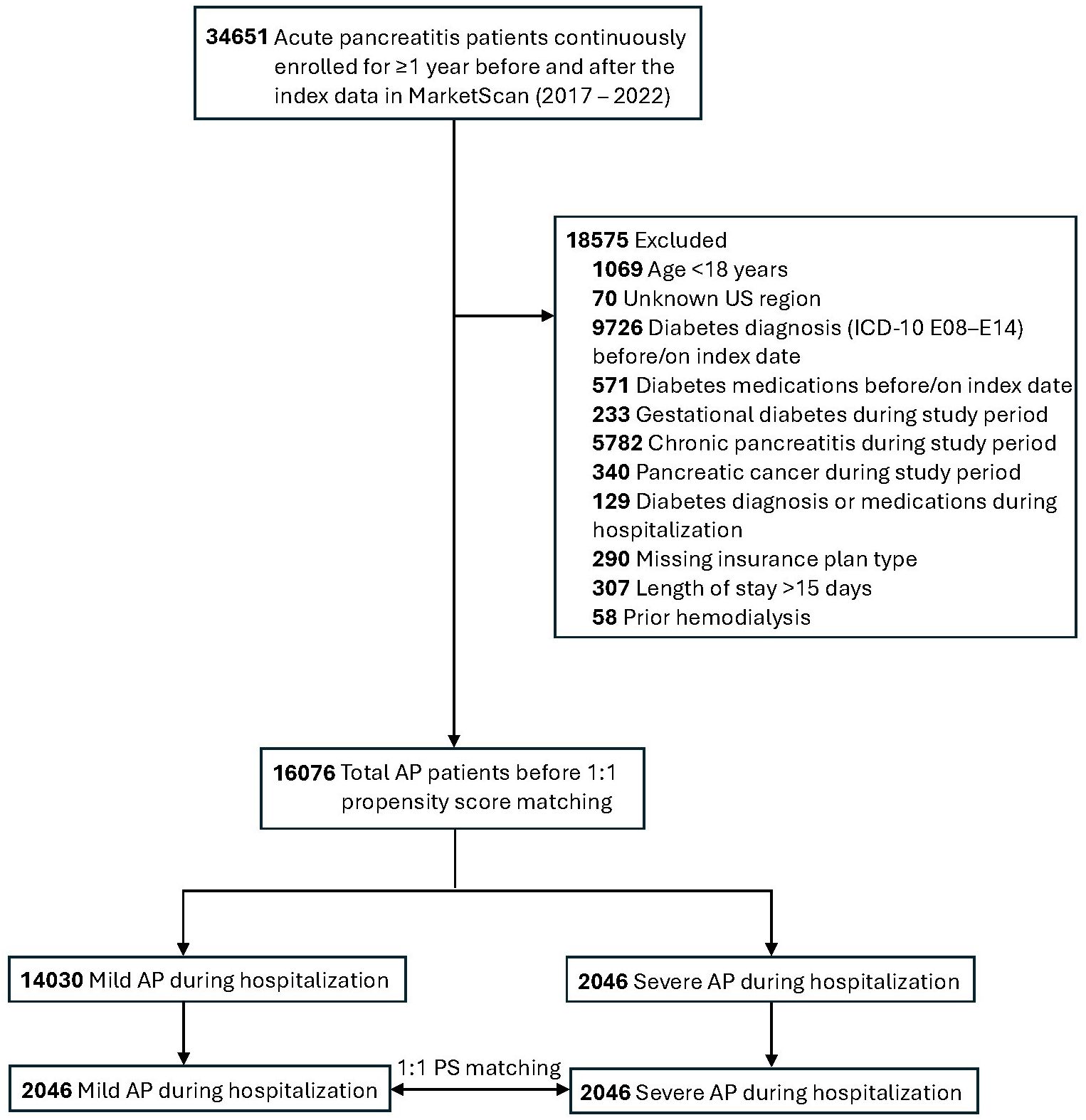 Methods: We conducted a retrospective cohort study using the Merative™ MarketScan® claims database (2016–2023), identifying patients with AP and no prior history of diabetes at baseline. The exposure, severe AP, was defined by any of the following during hospitalization: pancreatic necrosis, hemodialysis, organ failure, or mechanical ventilation. We used multivariable stratified Cox proportional hazards regression models with propensity score strata to assess the association between severe AP and incident diabetes.