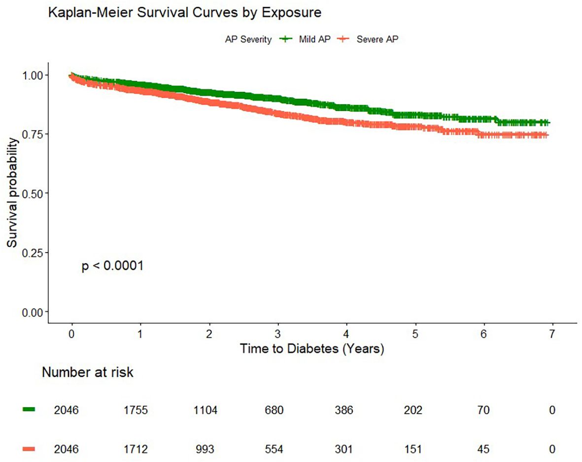 Discussion: In this large real-world data study, severe AP was associated with an increased risk of developing diabetes. These findings underscore the importance for glycemic surveillance and the need to consider proactive management of severe AP patients to mitigate their risk of poor health outcomes.