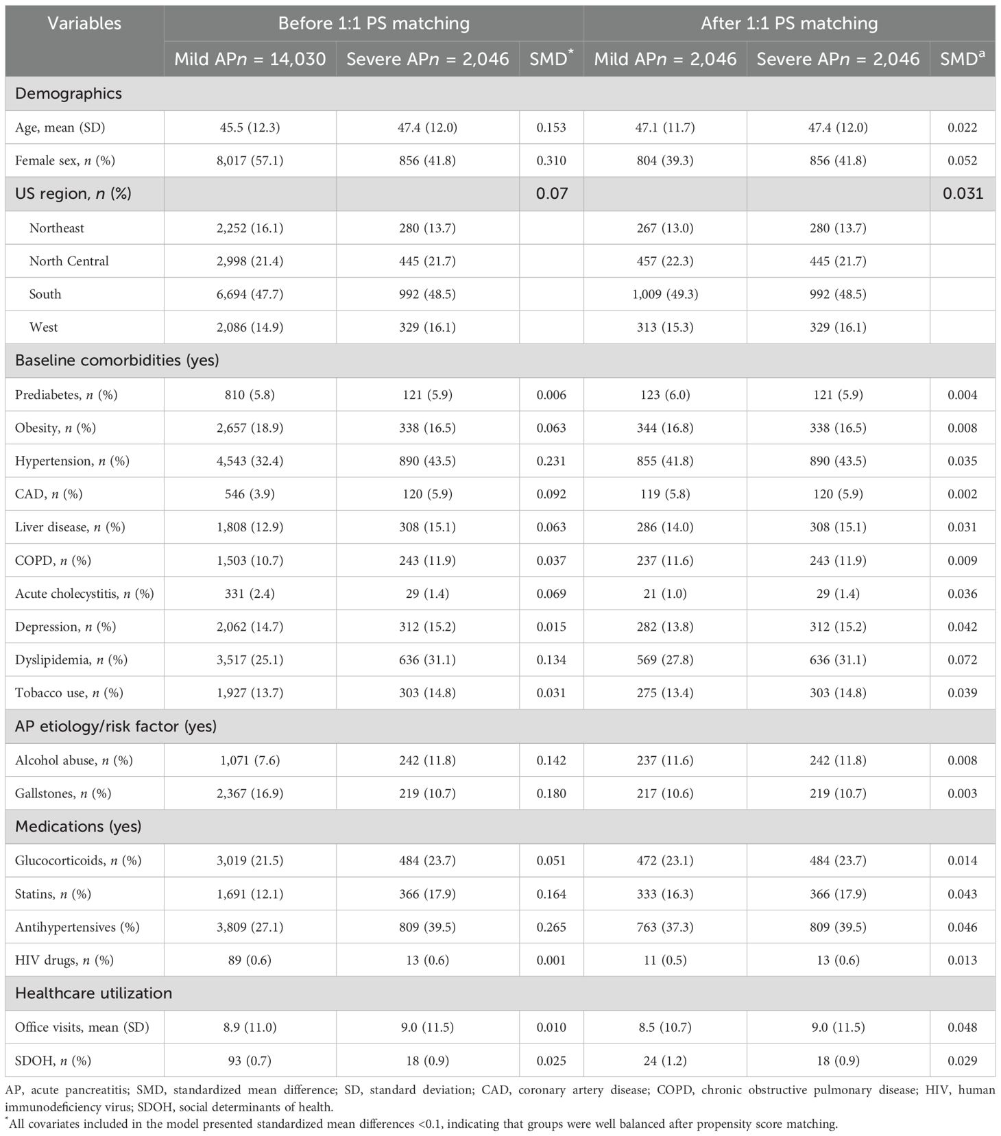 In univariable analyses, individuals with severe AP were older, were more likely to be female, reside in the Southern US, and have a history of hypertension, CAD, liver disease, COPD, depression, alcohol abuse, tobacco use, and dyslipidemia. They were also more likely to use glucocorticoids, statins, and antihypertensive medications. However, after propensity score matching, baseline characteristics were well balanced between groups, as indicated by standardized mean differences (SMD < 0.1; Table 1; Supplementary Figure 1).