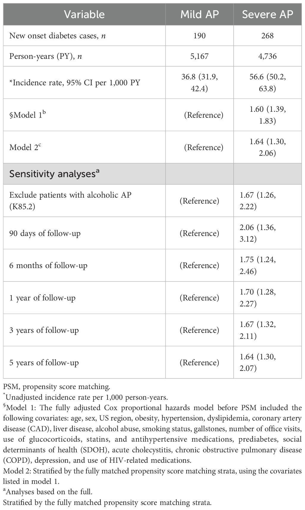 Results: The matched study population consisted of 2,046 patients with severe AP and 2,046 patients with mild AP, with baseline characteristics well balanced between groups. Individuals with severe AP had a higher risk of developing diabetes compared with those with mild AP [adjusted hazard ratio (aHR) = 1.64, 95% confidence interval (CI): 1.30–2.06], after accounting for propensity score matching. The association between severe AP and incident diabetes was stronger in men (aHR = 2.03, 95% CI: 1.50–2.74) than in women (aHR = 1.06, 95% CI: 0.69–1.64; P-interaction = 0.02).