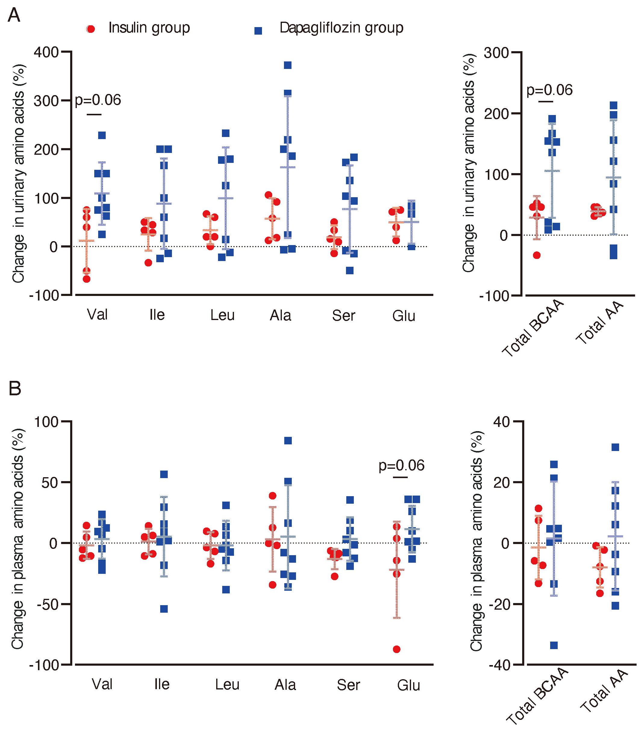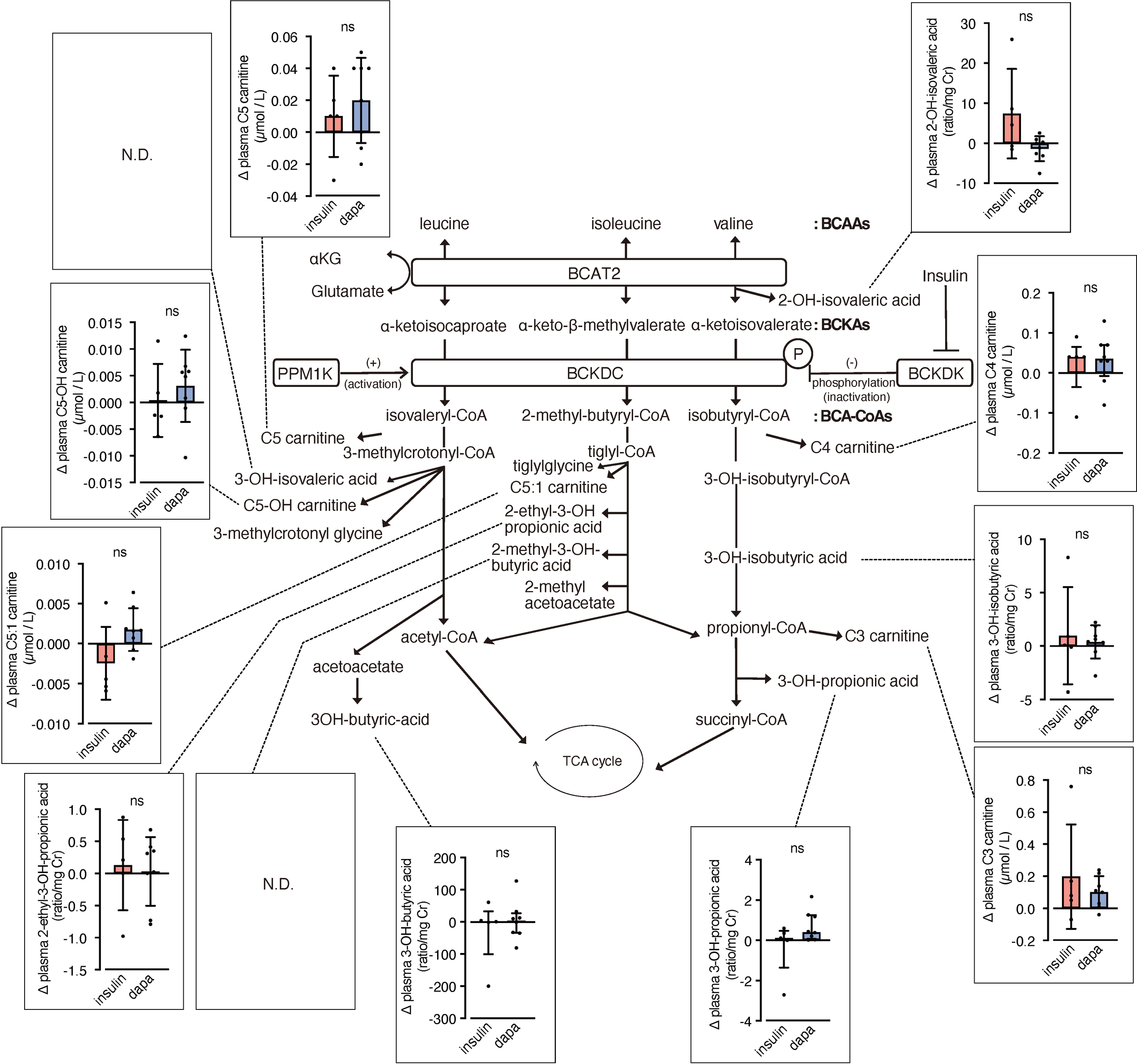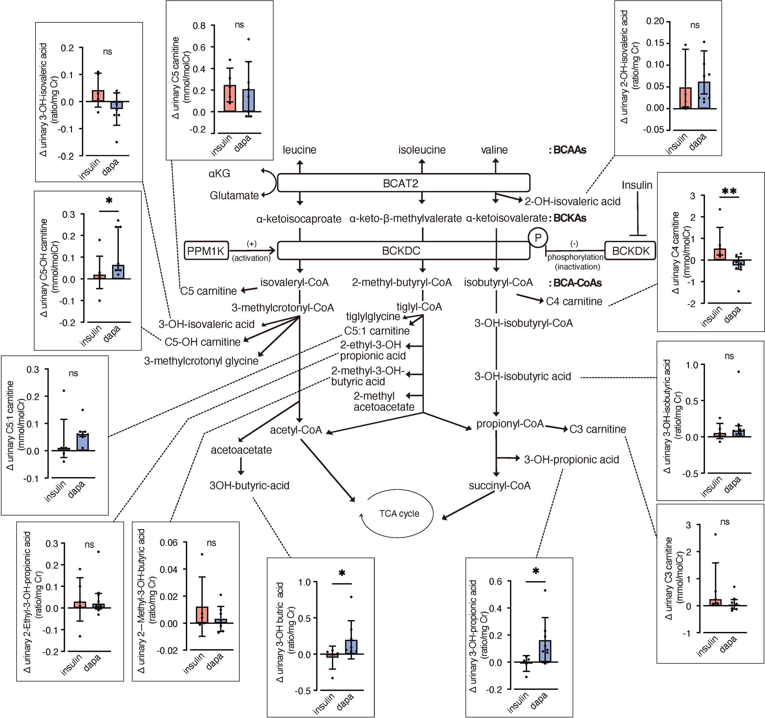 We conducted a prospective, single-center, open-label, nonrandomized, controlled clinical study in patients with type 2 diabetes stably treated with insulin, who were assigned to dapagliflozin (5 mg/day with dose-reduced insulin; n=8/9 completed) or insulin dose-up (n=5/8 completed). At 12 weeks, changes in urinary and plasma metabolites and short-chain acylcarnitines related to BCAA catabolism were quantified. To explore mechanisms, 10-week-old db/db mice received luseogliflozin (10 mg/kg/day, p.o.) or insulin glargine (10 U/day, s.c.) for 4 weeks; renal histology, mRNA and protein expression of key enzymes involved in BCAA catabolism, including branched-chain aminotransferase 2 (BCAT2), branched-chain ketoacid dehydrogenase (BCKDH), and BCKD kinase (BCKDK), were assessed.