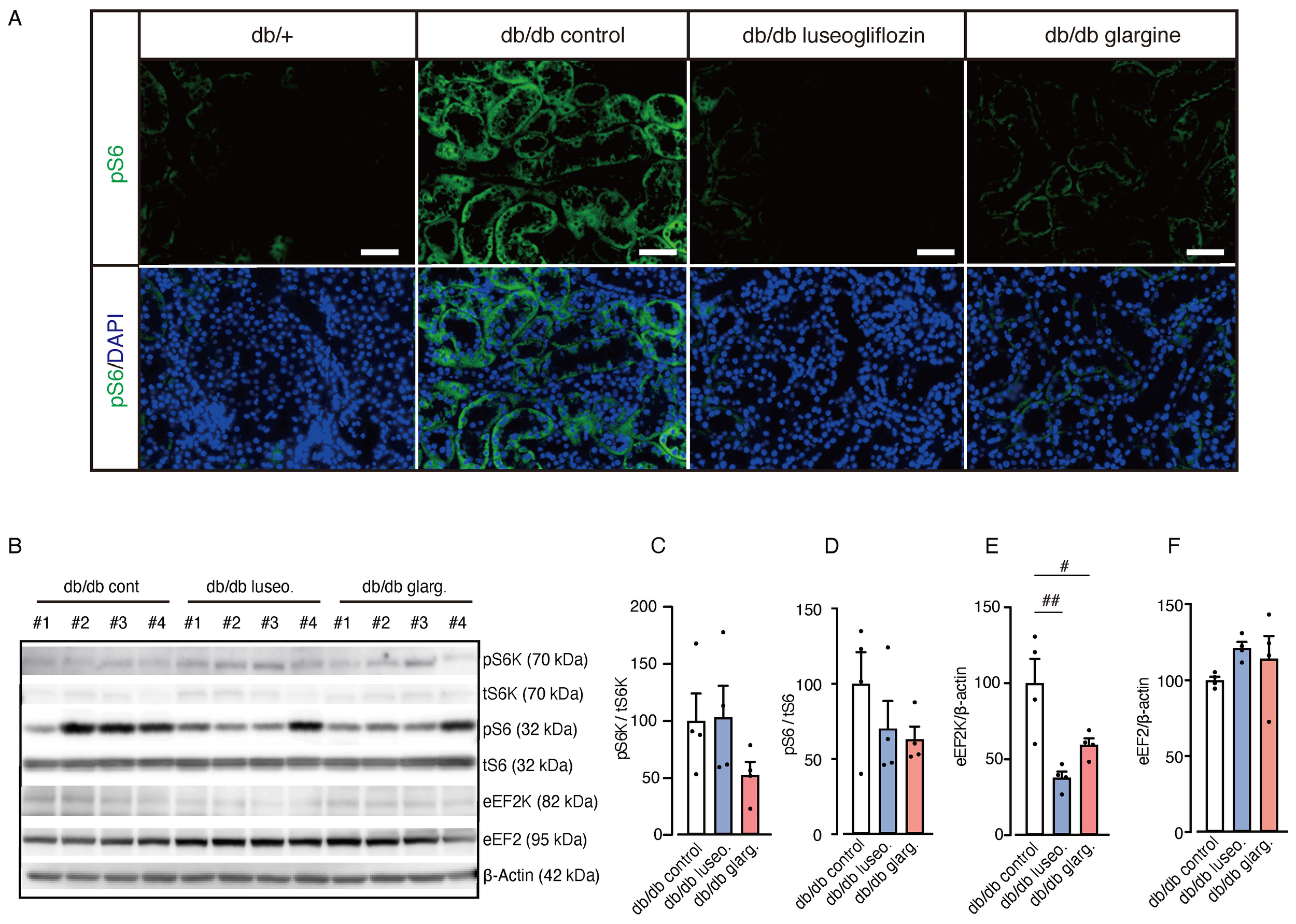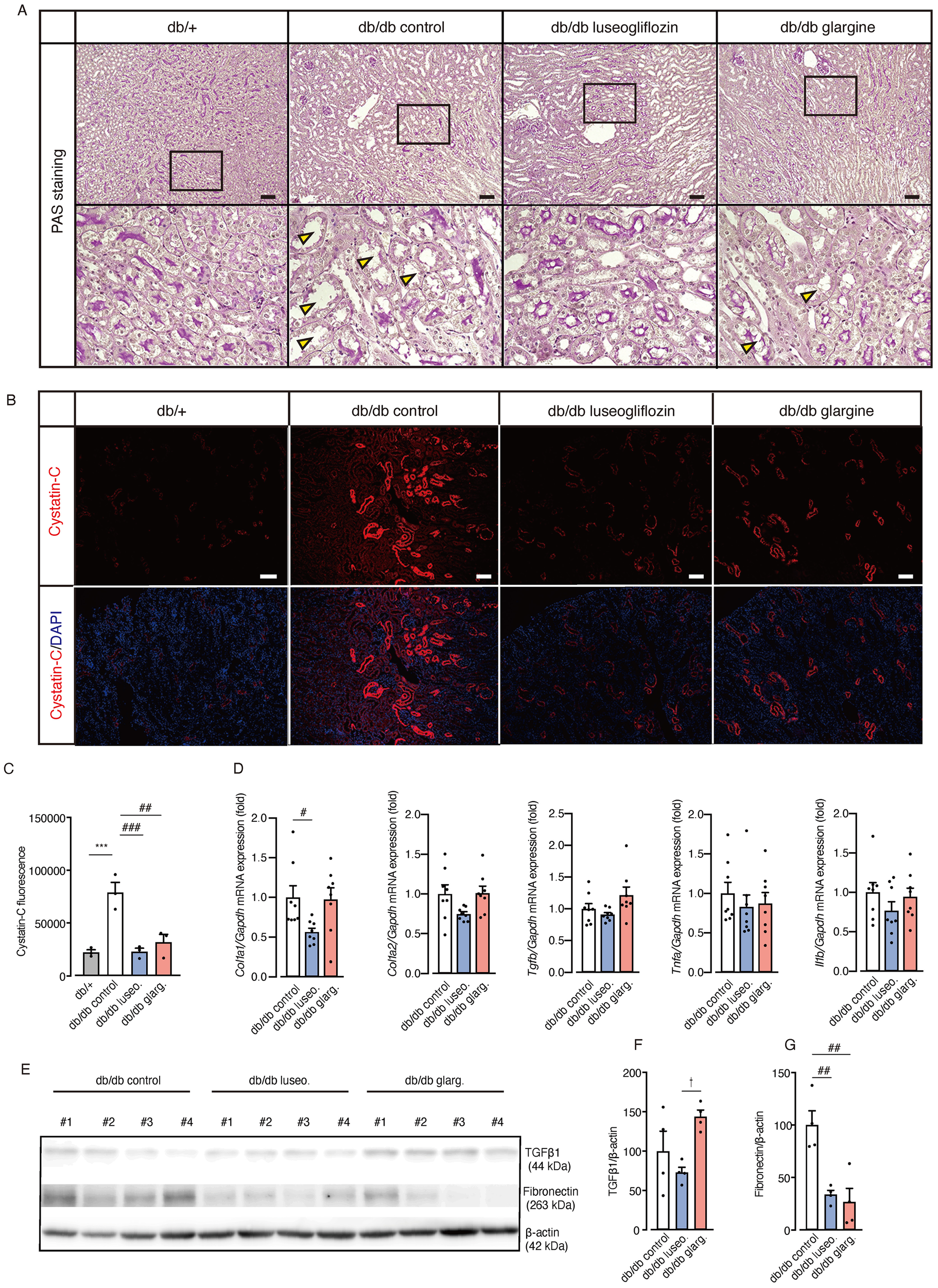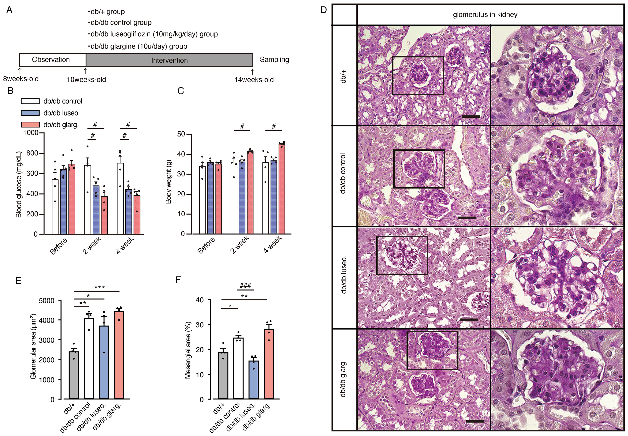 We used male mice exclusively to avoid potential confounding effects of estrogen on renal injury development. Db/db male mice (BKS.Cg-Dock7m+/+LeprdbJ) and db/+ mice were obtained from Charles River Laboratories Japan, Inc. The mice were housed individually and provided ad libitum access to diet (D12450JM, Research Diets, New Brunswick, NJ, USA) and were maintained under a 12-h light/dark cycle. Ten-week-old male db/db mice were randomly assigned to experimental groups (n = 4–8 per group) and subjected to the intervention for 4 weeks, while an untreated control group was maintained under the same conditions. The luseogliflozin-treated group received a daily oral gavage of 10 mg/kg luseogliflozin diluted in water, while the glargine-treated group received a daily subcutaneous injection of 10 U insulin glargine. The doses of drugs were determined based on previous studies (20–22). Random blood glucose levels were measured weekly using a Glutest Sensor (Sanwa Kagaku, Nagoya, Japan). Mice were maintained under ad libitum feeding conditions and sacrificed under isoflurane anesthesia at Zeitgeber time 6 (mid-light phase) for tissue collection. Histological analyses were performed in four groups: db/db control, db/db luseogliflozin, db/db glargine, and db/+ as a non-diabetic control. The db/+ group was excluded from other quantitative analyses to account for the potential effects of genetic background. All experiments were conducted in accordance with institutional guidelines and approved by the ethics committee of Kurume University School of Medicine (approval number: 2020-131).