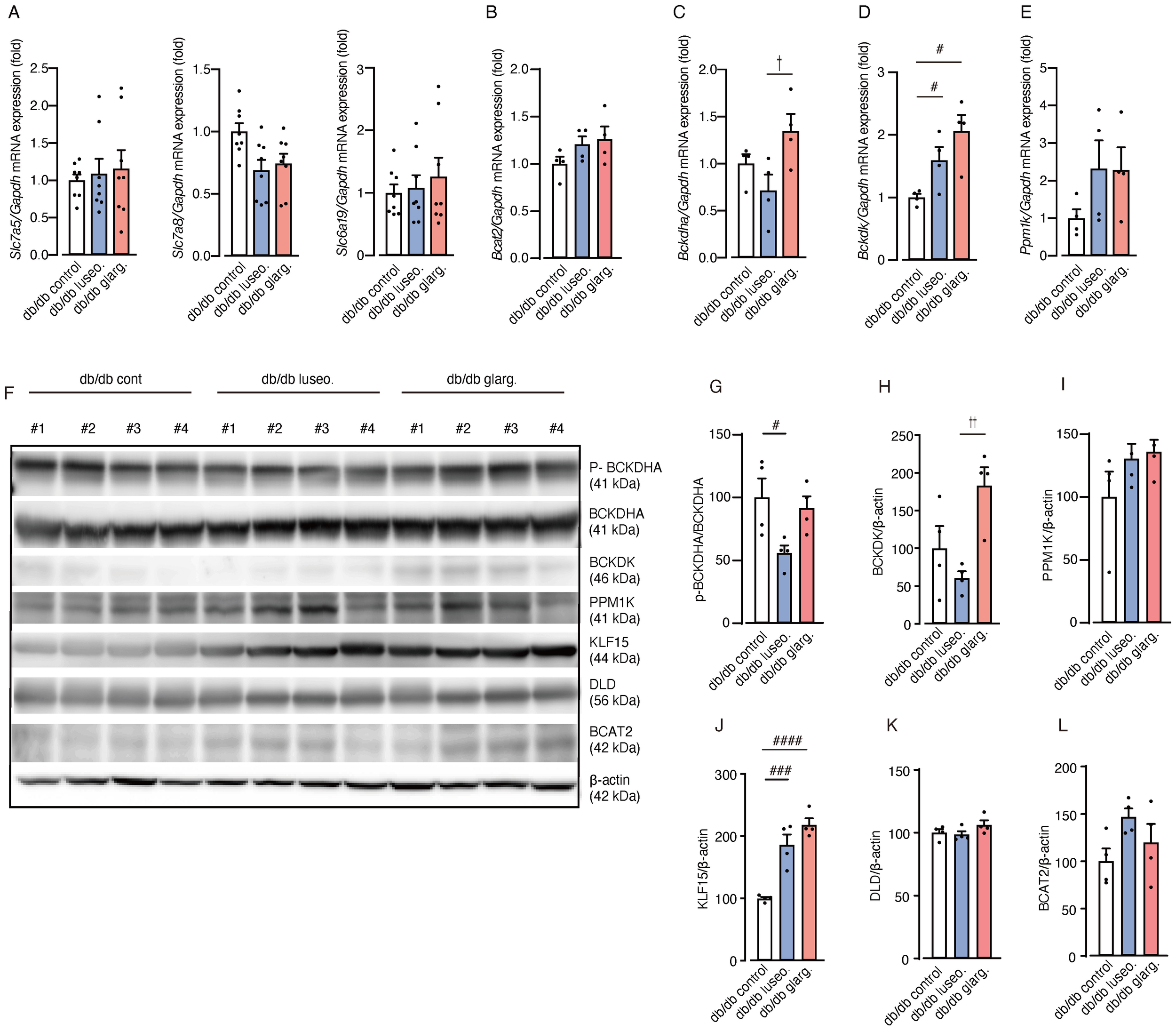 Dapagliflozin treatment induced greater increases in urinary excretion of three BCAA-derived metabolites—3-hydroxypropionic acid, C5-OH carnitine, and 3-hydroxybutyric acid—compared with insulin at comparable glycemic levels. In contrast, C4 carnitine (an earlier metabolite in valine catabolism) rose more with insulin. No corresponding between-group differences were detected in plasma metabolites. In db/db mice, luseogliflozin attenuated glomerular mesangial expansion and tubular epithelial atrophy, and reduced Col1a1 mRNA and TGF-β1 protein, compared with glargine at comparable glycemic levels. Luseogliflozin decreased the phosphorylated (inactive) form of the BCKDH E1α subunit (p-BCKDHA/BCKDHA) and lowered BCKDK protein. mRNA expression of amino acid transporters and BCAT2 expression was unchanged.