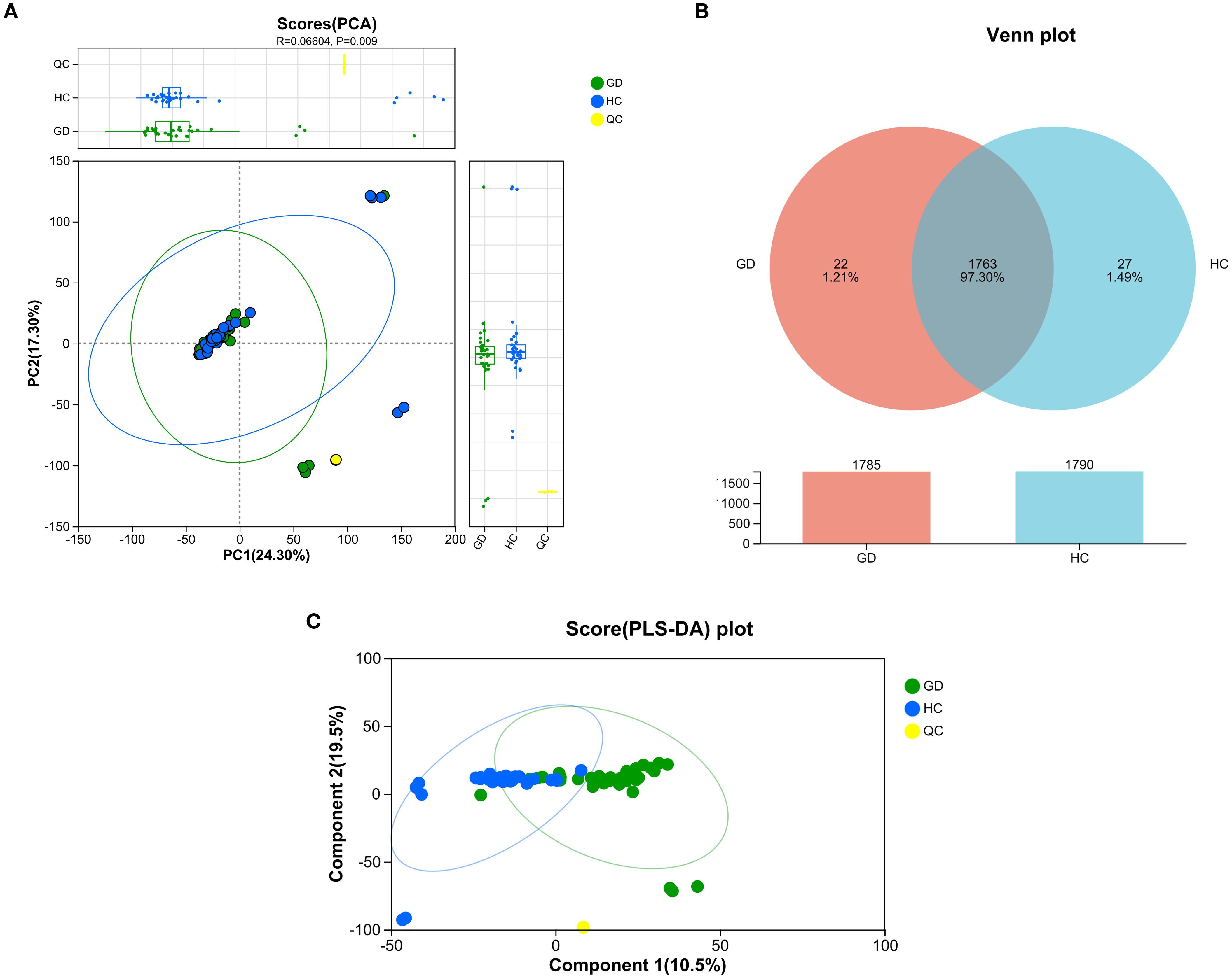 Figure 1. Multivariate analysis of serum metabolomic profiles from Graves’ disease patients and healthy controls. (A) Principal component analysis (PCA) score plot showing partial separation between GD patients, healthy controls (HCs), and quality control (QC) samples. PC1 and PC2 explain 24.30% and 17.30% of the total variance, respectively (R² = 0.066, p = 0.009). (B) Venn diagram illustrating the overlap and unique metabolic features between the GD and HC groups. (C) PLS-DA score plot demonstrating clear separation between GD and HC groups along the first two components (10.5% and 19.5% of variance, respectively).