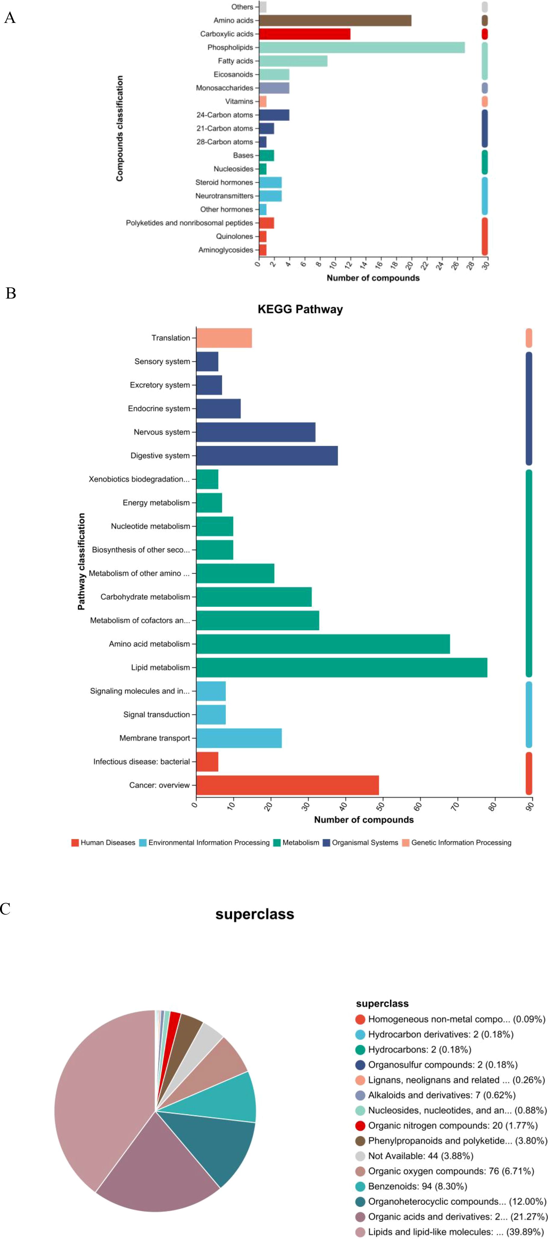 Figure 2. Classification and pathway analysis of differentially abundant metabolites. (A) Bar chart of KEGG compound classification showing the predominance of lipids and organic acids among altered metabolites in GD. (B) KEGG pathway enrichment analysis highlighting significantly enriched metabolic pathways, including linoleic acid and arachidonic acid metabolism. (C) Pie chart of HMDB superclass distribution confirming the dominance of lipids and lipid-like molecules (39.89%) and organic acids and derivatives (21.27%).