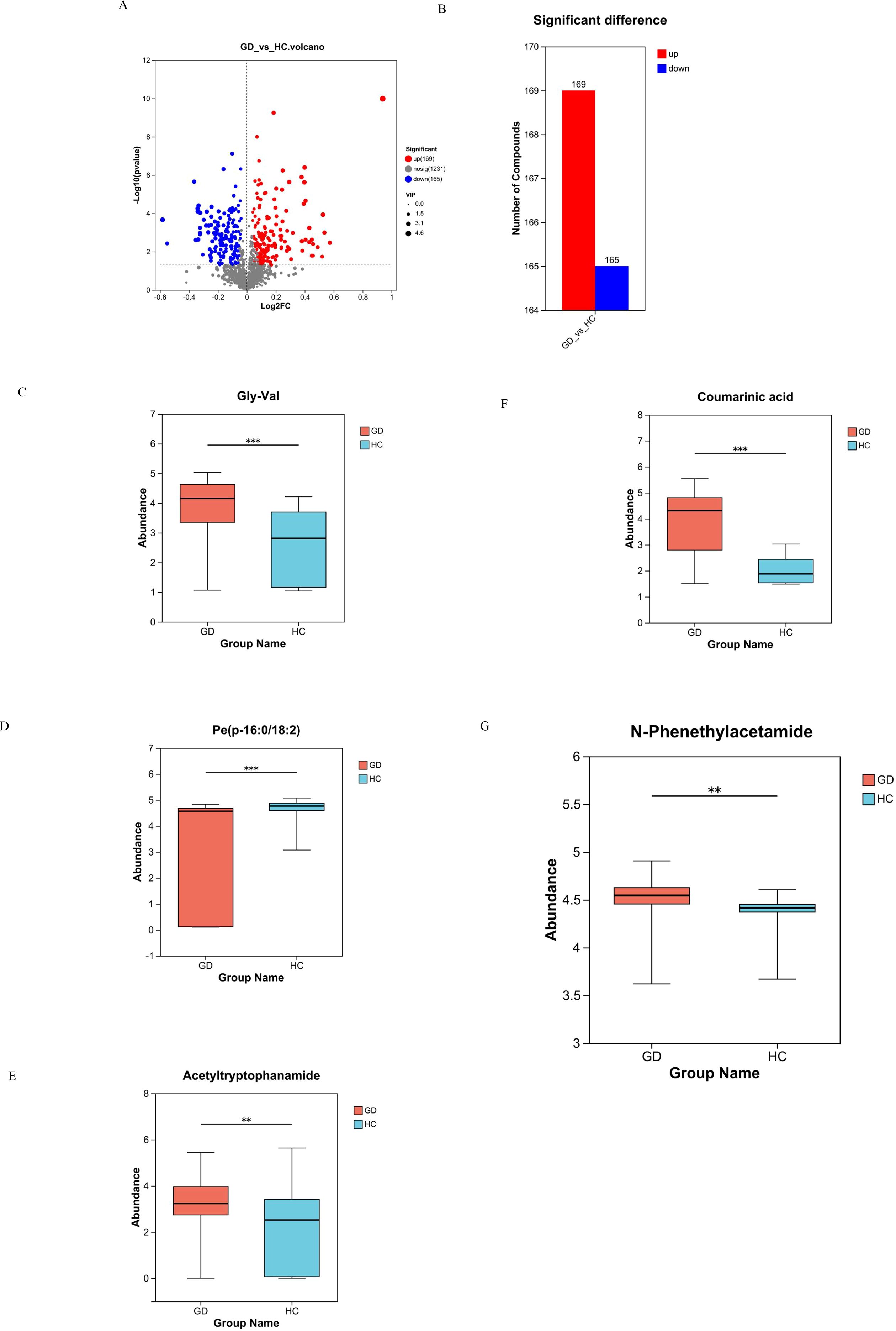 Figure 3. Volcano plot and box plots of key differential metabolites. (A, B) Volcano plot visualizing 334 significantly dysregulated metabolites (169 upregulated, 165 downregulated) in GD vs. HC. (C–G) Box plots comparing the abundance of selected metabolites: (C) Gly-Val, (D) PE(P-16:0/18:2), (E) acetyltryptophanamide, (F) coumaric acid, and (G) N-phenethylacetamide. ** 0.001 < P ≤ 0.01, *** P ≤ 0.001.