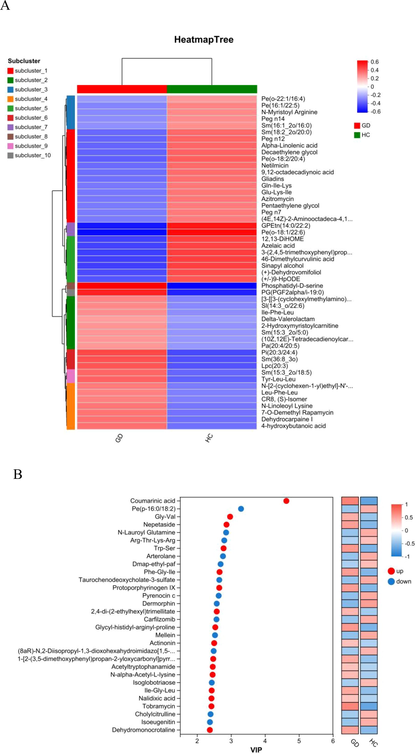 Figure 4. Hierarchical clustering and variable importance analysis. (A) Heatmap of hierarchical clustering showing distinct metabolomic patterns between the GD and HC groups, with metabolites grouped into co-expression subclusters. (B) VIP plot from the OPLS-DA model ranking the top 30 metabolites contributing to group separation (VIP > 1).