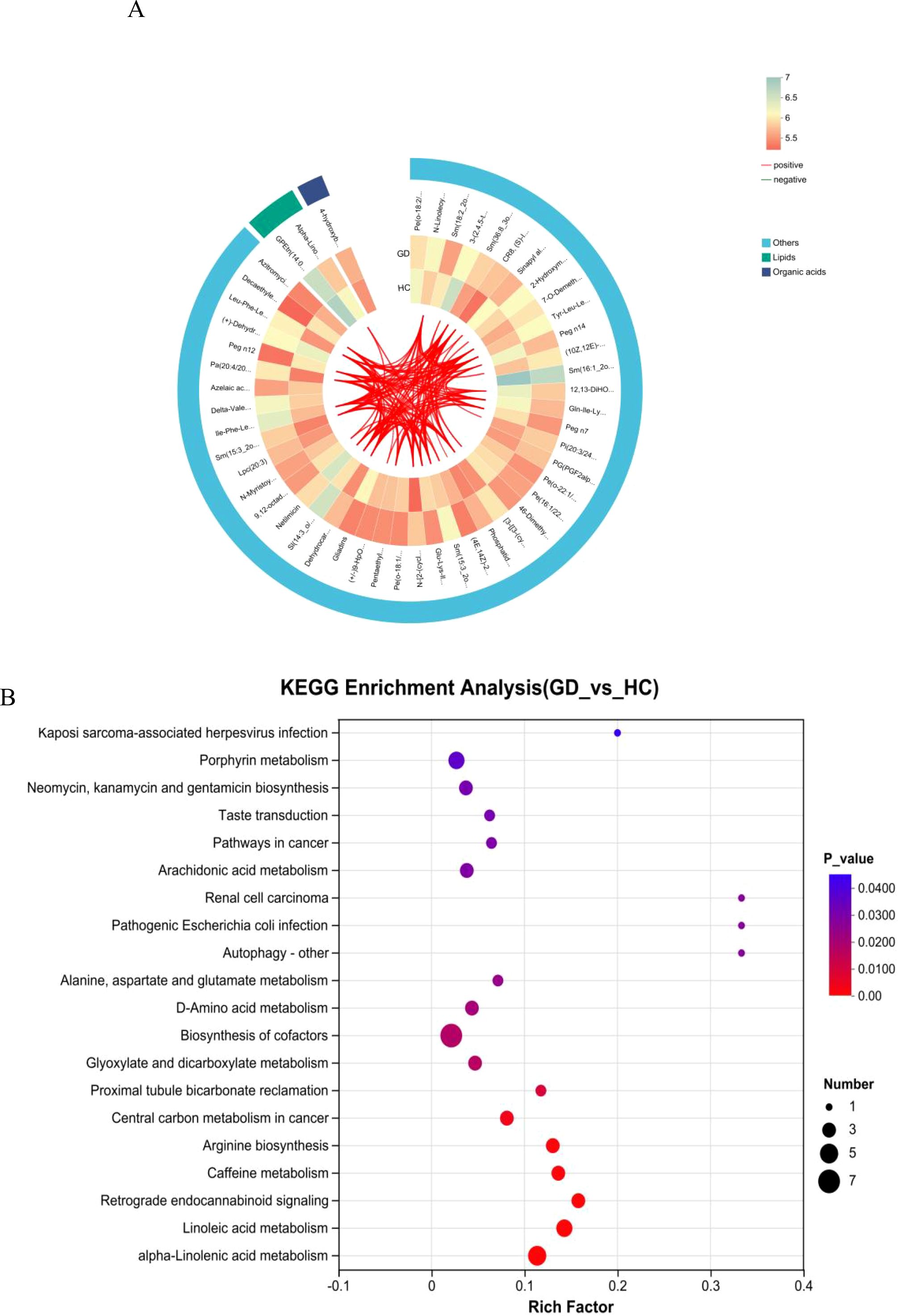 Figure 5. Correlation network and pathway enrichment analysis. (A) Chord diagram depicting correlation networks among significantly altered metabolites, grouped into lipids, organic acids, and others. (B) Bubble plot of the KEGG pathway enrichment analysis showing the most significantly altered pathways in GD.