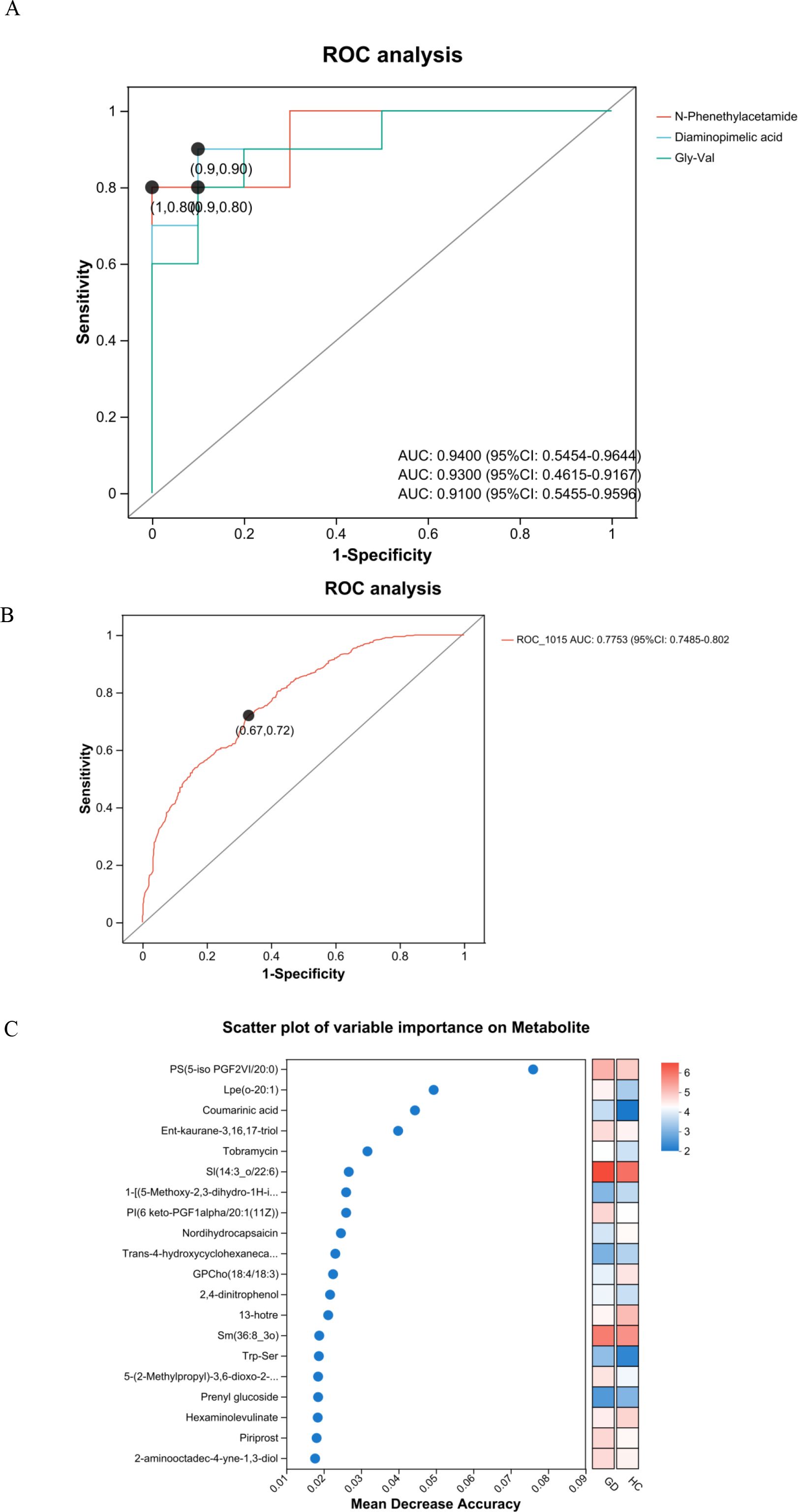 Figure 7. Receiver operating characteristic (ROC) curves and variable importance scatter plot. (A) ROC curves of candidate serum metabolites for discriminating patients with Graves’ disease from healthy controls. (B) ROC curve for the multimetabolite panel combination, showing an AUC of 0.775 (95% CI: 0.749–0.802). (C) Scatter plot of variable importance based on mean decrease accuracy.