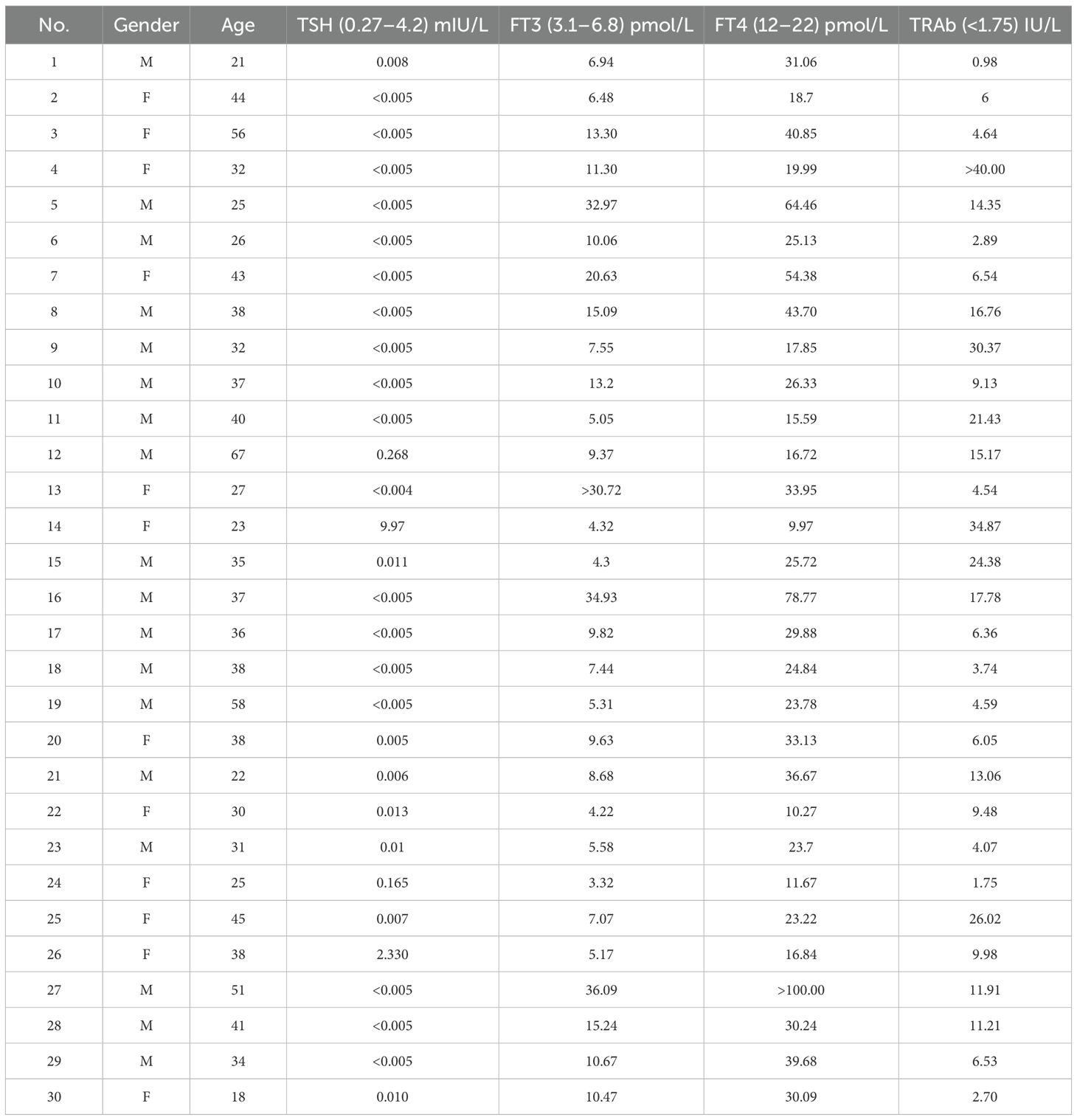 Table 1. Baseline clinical and biochemical characteristics of the study cohort with untreated Graves’ disease (n = 30; M, male; F, female).