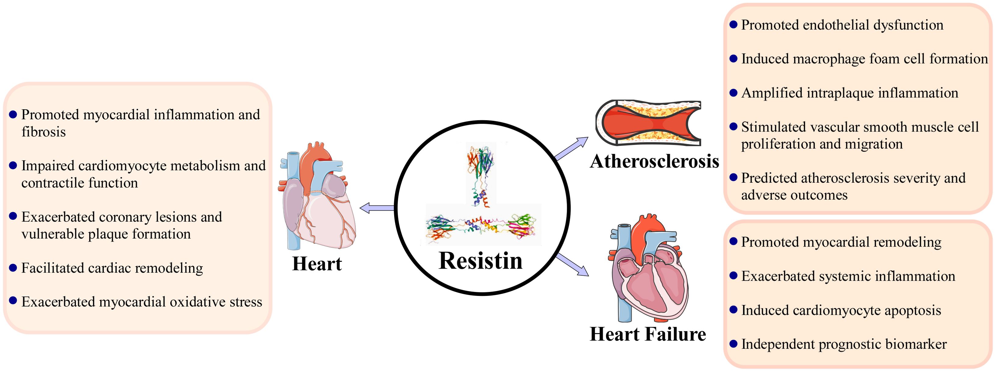 Substantial evidence from both basic and clinical studies positions resistin as a critical adipokine at the intersection of metabolic dysfunction, chronic inflammation, and cardiovascular disease pathogenesis. Unlike in rodents, human resistin is primarily secreted by immune cells, underscoring its fundamental role as a mediator of systemic and vascular inflammation rather than a direct regulator of glucose metabolism. Through its engagement with key receptors, notably TLR4 and CAP-1, resistin activates a cascade of proinflammatory signaling pathways, including NF-κB and MAPK, which drive endothelial dysfunction, promote leukocyte adhesion and migration, and initiate early atherosclerotic processes. Beyond the vasculature, resistin exerts direct detrimental effects on the myocardium by disrupting cardiomyocyte calcium handling and mitochondrial energetics, inducing pathological hypertrophy, and stimulating robust cardiac fibrosis via mechanisms involving JAK/STAT3 and TGF-β signaling. Its ability to modulate neurohormonal pathways, including enhancing sympathetic outflow and interacting with the endocannabinoid system, further integrates resistin into a complex network that exacerbates hypertension, arrhythmogenesis, and adverse cardiac remodeling.