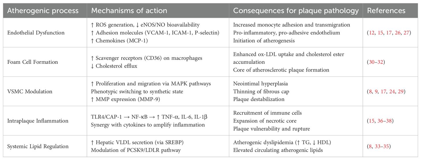 Resistin critically promotes atherosclerosis by inducing macrophage foam cell formation. It upregulates scavenger receptors including CD36 and class A scavenger receptor on macrophages, thereby facilitating oxidized low-density lipoprotein (ox-LDL) uptake and intracellular cholesteryl ester accumulation (30, 31). Concurrently, resistin suppresses cholesterol efflux through downregulation of ATP-binding cassette transporter A1 expression, exacerbating lipid retention within atherosclerotic plaques (32). Additionally, resistin stimulates hepatic very low-density lipoprotein secretion and upregulates proprotein convertase subtilisin/kexin type 9 (8, 33, 34). This upregulation reduces hepatic low-density lipoprotein receptor expression, elevating circulating levels of atherogenic lipids (35). Collectively, these actions establish a lipid-rich microenvironment that accelerates plaque progression and instability.