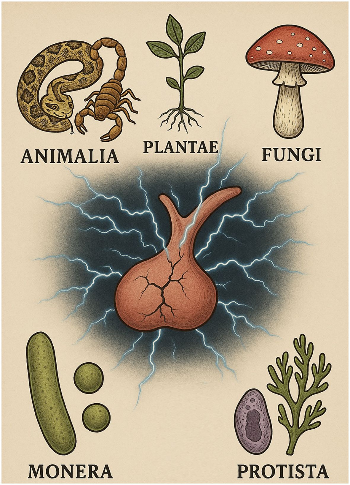 Figure 1. Schematic representation of the five biological kingdoms (Animalia, Plantae, Fungi, Monera and Protista) and their potential impact on pituitary function. AI-assisted visualization; verified by authors.
