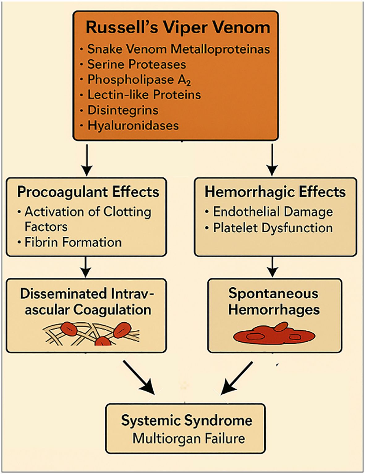 Figure 2. Mechanisms of Russell’s viper venom, including coagulopathy, endothelial injury, and disseminated intravascular coagulation leading to multiorgan failure. AI-assisted visualization; verified by authors.