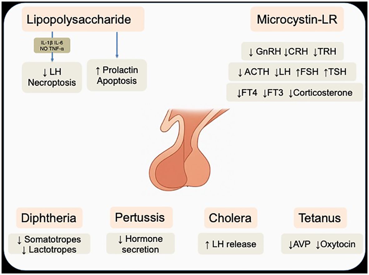 Figure 3. Effects of LPS, microcystin, and classical bacterial toxins on pituitary hormone regulation and cellular function. Note that lipopolysaccharide can act either directly on pituitary cells or indirectly through cytokine-mediated pathways. Acronyms: IL-1β, interleukin-1β; IL-6, interleukin-6, TNF-α, Tumor necrosis factor-α; NO, nitric oxide; GnRH, gonadotropin–releasing hormone; CRH, corticotropin–releasing hormone; TRH, thyrotropin–releasing hormone; ACTH, adrenocorticotropic hormone; LH, luteinizing hormone; FSH, follicle stimulating hormone; TSH, thyroid stimulating hormone; FT4, free T4; FT3, free T3; ADH, antidiuretic hormone. Note that the anatomical illustration of the pituitary gland was AI-generated using OpenAI DALL·E (2025) and verified by authors.
