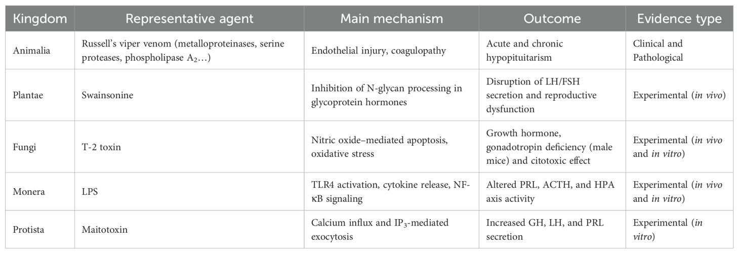 After reviewing the different biological kingdoms, the main biologically derived agents and their effects on pituitary function can be summarized comparatively. Table 1 provides an integrative overview of representative toxins, their principal mechanisms, and documented endocrine outcomes according to the available type of evidence.