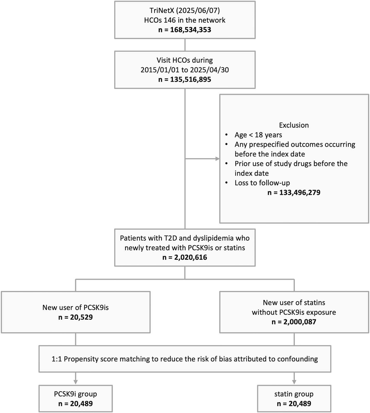 Based on a screening of 168,534,353 individuals across 146 HCOs TriNetX networks as of June 7, 2025, a total of 135,516,895 individuals with documented HCO visits from January 1, 2015, to April 30, 2025, were identified. After applying exclusion criteria, 2,020,616 individuals with T2D and dyslipidemia who were newly treated with PCSK9i or statins were included, comprising 20,529 new users of PCSK9i and 2,000,087 new users of statins. Following PSM, 20,489 individuals were assigned to each of the PCSK9i and statin groups (Figure 1).