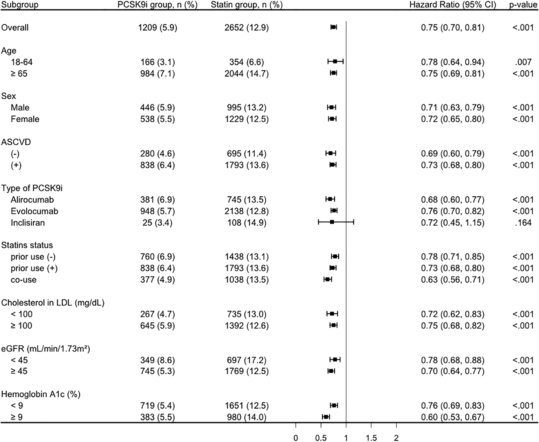 Subgroup analyses were pre-specified according to demographic and clinical factors. The demographic subgroups included sex and two age categories, namely 18 to 64 years and 65 years or older. Additional subgroup comparisons were conducted according to the presence of atherosclerotic cardiovascular disease, the specific type of PCSK9i used, concurrent statin therapy among PCSK9i users, and baseline levels of LDL-C, eGFR, and HbA1c.