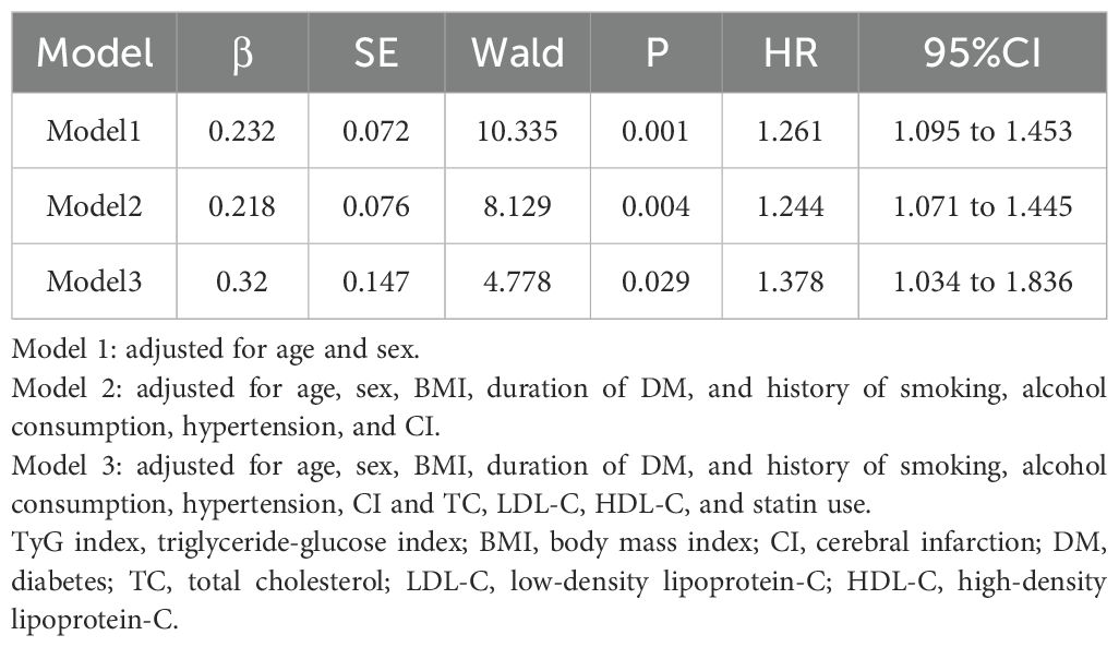 Cox proportional hazards regression models showed that, after adjusting for confounding factors in Models 1, 2, and 3, the risk of carotid plaque progression in patients with T2DM increased with a higher TyG index, with hazard ratios (HRs) of 1.261, 1.244, and 1.378, respectively (all p < 0.05; Table 3).