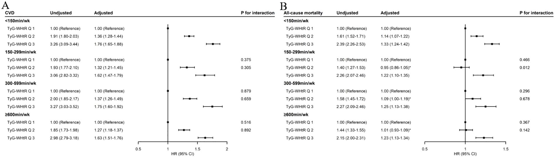 Figure 1. Associations of TyG-WHtR index with incident CVD (A) and all-cause mortality (B) by MVPA. MVPA, moderate-to-vigorous physical activity; TyG-WHtR, triglyceride–glucose–waist-to-height ratio; CVD, cardiovascular disease; HR, hazard ratio; CI, confidence interval. The p-value for interaction was obtained by including the product term of TyG-WHtR index (tertiles) and MVPA (four groups) in the multivariable-adjusted model, in which TyG-WHtR Q3 and < 150 min/week MVPA was set as the reference group. The multivariable-adjusted model was adjusted for age, sex, race, education level, Townsend deprivation index, smoking status, drinking status, parental history of CVD, self-reported use of antihypertensive drugs, self-reported use of lipid-lowering drugs, and self-reported use of insulin. *Value indicates no statistical significance.
