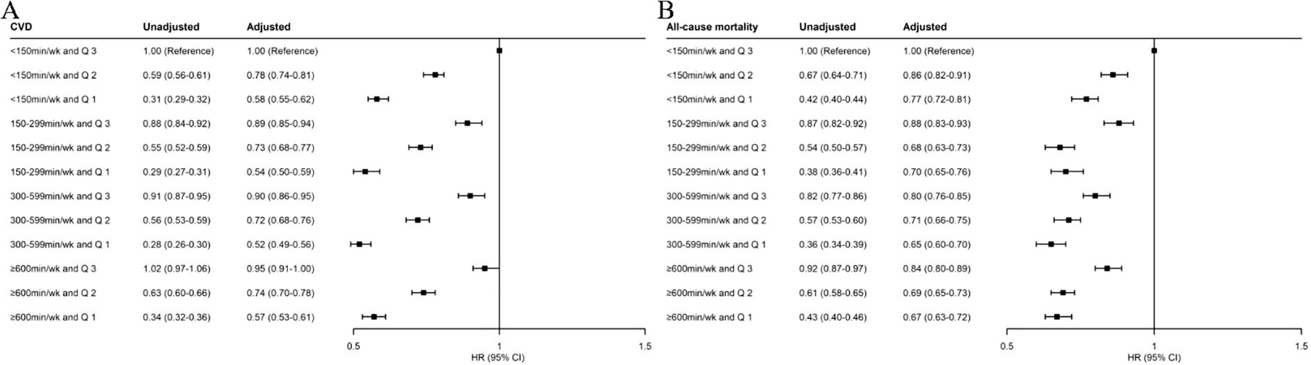 Compared with the reference group, all other combined groups were also associated with lower risks of all-cause mortality (Figure 2). The HRs (95% CIs) of all-cause mortality for TyG-WHtR tertile 3 were 1.00 (reference) in the < 150-min/week MVPA group, 0.88 (0.83–0.93) in the 150–299-min/week MVPA group, 0.80 (0.76–0.85) in the 300–599-min/week MVPA group, and 0.84 (0.80–0.89) in the ≥ 600-min/week MVPA group. The HRs (95% CIs) of all-cause mortality for TyG-WHtR tertile 2 were 0.86 (0.82–0.91), 0.68 (0.63–0.73), 0.71 (0.66–0.75), and 0.69 (0.65–0.73), respectively. The HRs (95% CIs) of all-cause mortality for TyG-WHtR tertile 1 were 0.77 (0.72–0.81), 0.70 (0.65–0.76), 0.65 (0.60–0.70), and 0.67 (0.63–0.72), respectively.
