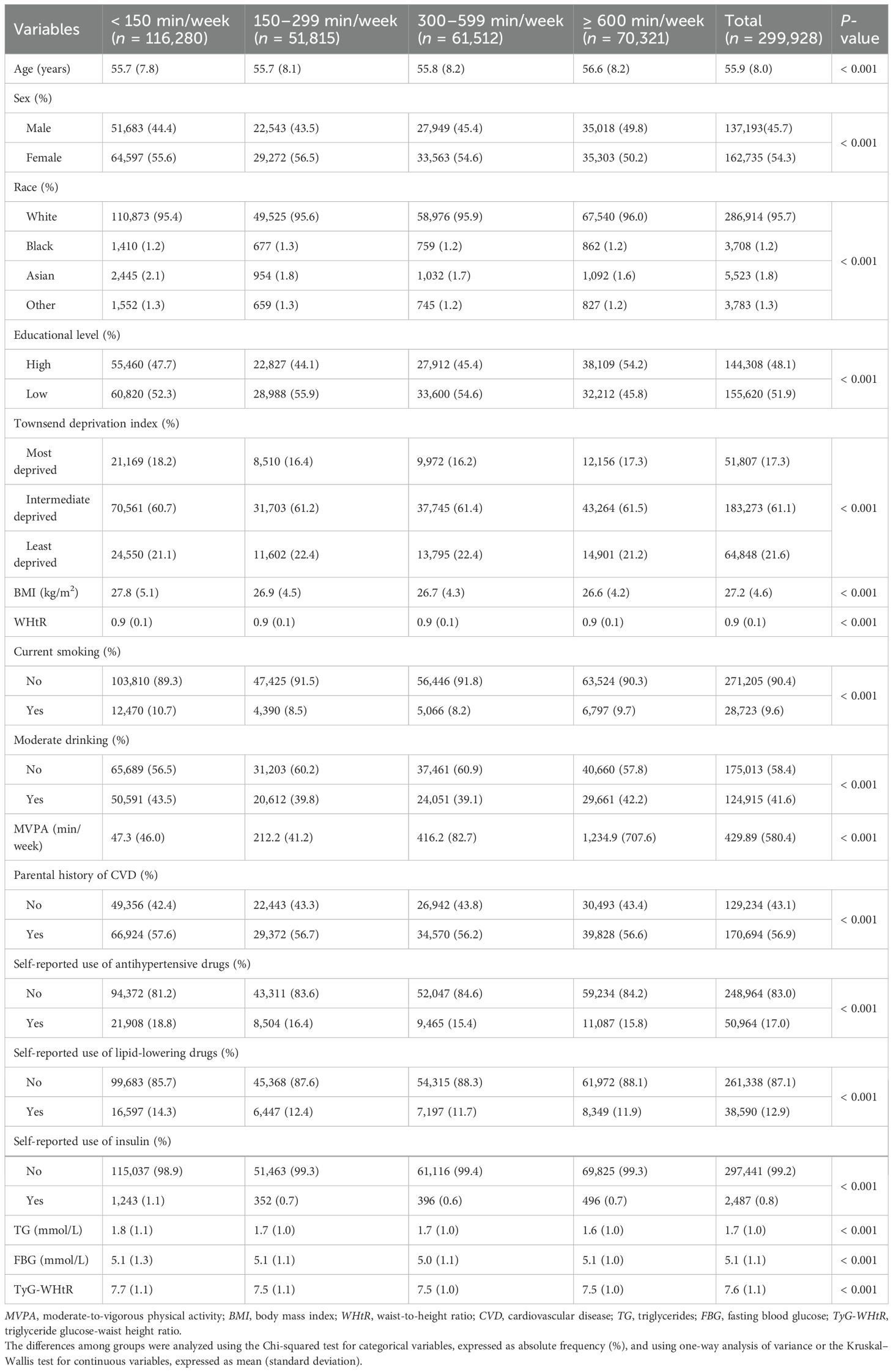 Methods: This cohort study included 299,928 adults from the UK Biobank study who were free of prevalent CVD at baseline and had complete data on MVPA, the TyG-WHtR index, and relevant covariates. The Cox proportional hazards model was used to assess the independent and joint associations of MVPA and TyG-WHtR with incident CVD and all-cause mortality. A product term of MVPA (< 150, 150–299, 300–599, and ≥ 600 min/week) and TyG-WHtR (tertiles) was included in the model to assess multiplicative interaction.