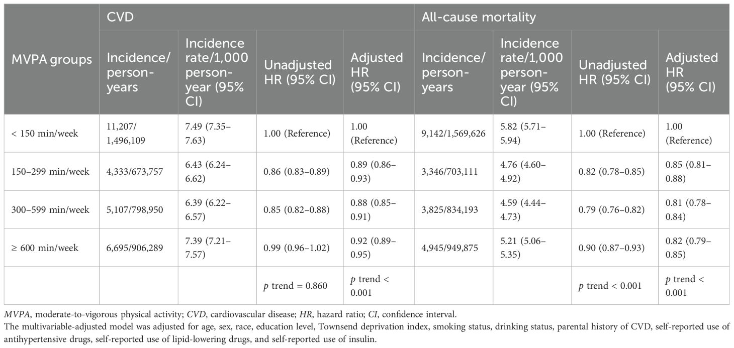 Independent associations of MVPA or TyG-WHtR index with incident CVD and all-cause mortality