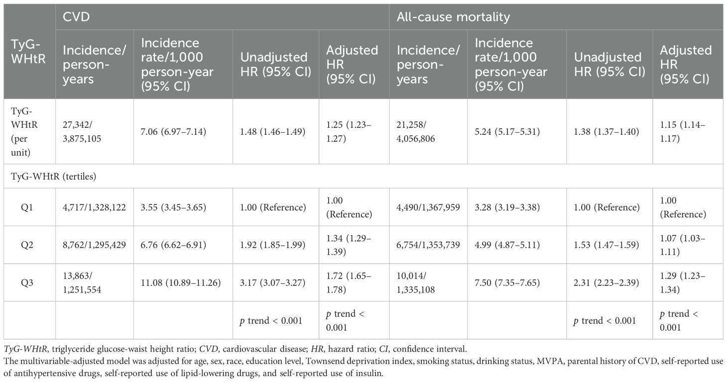 Independent associations of the TyG-WHtR index with incident CVD and all-cause mortality are shown in Table 3. Each additional unit of the TyG-WHtR index was associated with a 25% higher risk of CVD (HR, 1.25; 95% CI, 1.23–1.27) and a 15% higher risk of all-cause mortality (HR, 1.15; 95% CI, 1.14–1.17). Compared with TyG-WHtR tertile 1, higher TyG-WHtR tertiles were associated with increased risks of CVD incidence and all-cause mortality. The HRs (95% CIs) for CVD in TyG-WHtR tertile 2 and tertile 3 were 1.34 (1.29–1.39) and 1.72 (1.65–1.78), respectively (p for trend < 0.001). Similarly, the HRs (95% CIs) for all-cause mortality in TyG-WHtR tertile 2 and tertile 3 were 1.07 (1.03–1.11) and 1.29 (1.23–1.34), respectively (p for trend < 0.001). Additionally, the RCS regression model revealed positive nonlinear dose–response relationships of the TyG-WHtR index with CVD and all-cause mortality (all overall p < 0.001, all nonlinear p < 0.001) (Supplementary Figure S2).