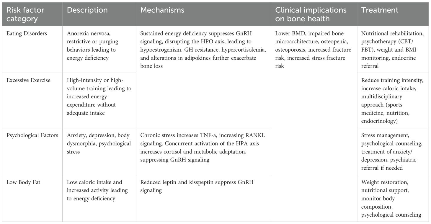 FHA in adolescent females is a multifactorial condition that arises from an intricate interplay of physiological, psychological, and behavioral stressors (Table 1). The primary contributors to FHA include disordered eating patterns, excessive exercise, psychological stress, and low body fat, all of which can have profound implications for bone health and overall well-being (31).
