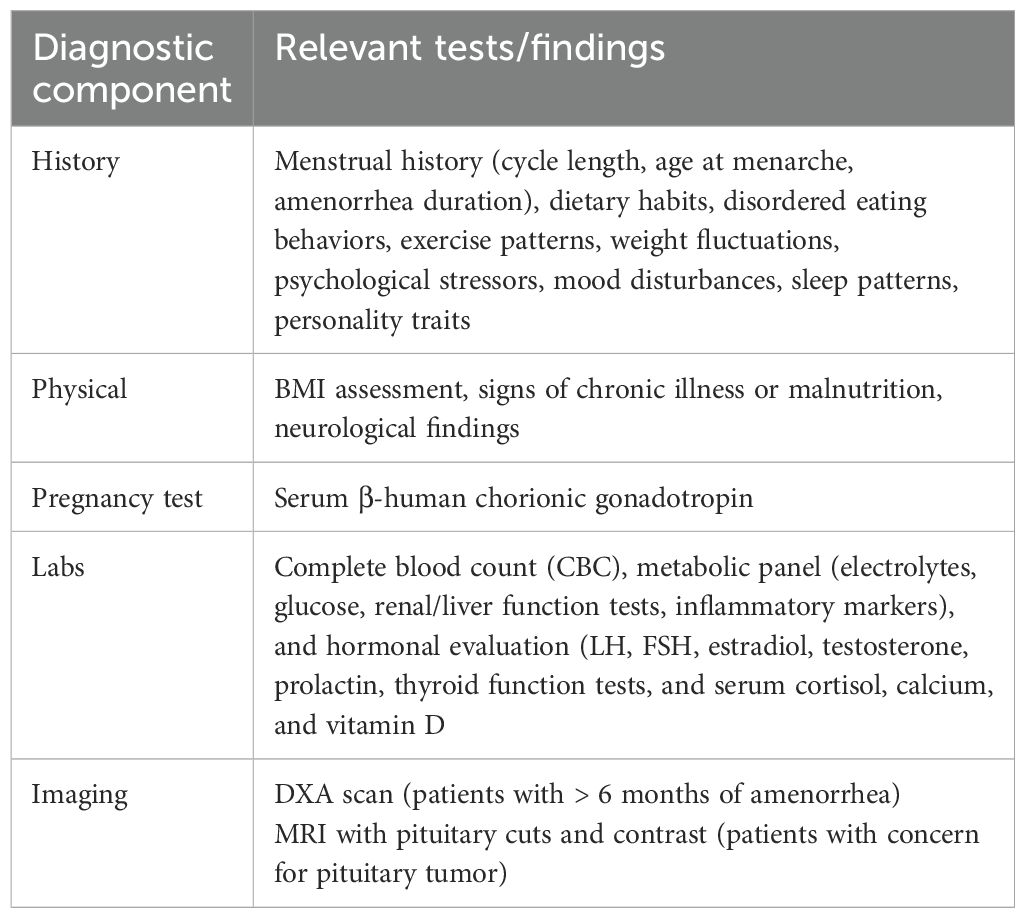 The diagnosis of FHA is one of exclusion, requiring a comprehensive evaluation to rule out anatomic or organic causes of menstrual dysfunction (Table 2). Clinicians should consider FHA in adolescents and women with persistent menstrual cycle intervals exceeding 45 days or those experiencing absent menses for three months or more (47). A thorough clinical assessment begins with a detailed personal history, focusing on dietary habits, disordered eating behaviors, exercise patterns, weight fluctuations, stressors, mood disturbances, sleep patterns, and personality traits such as perfectionism and a high need for social approval. Additionally, a family history of eating disorders, psychiatric diagnoses, reproductive disorders, or menstrual irregularities should be obtained to identify potential genetic or environmental predispositions (1).