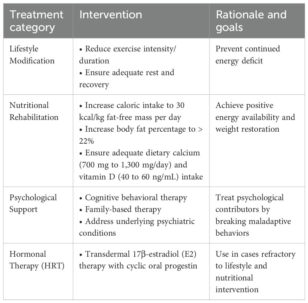 The cornerstone of FHA management is lifestyle modification. Increasing energy availability through adequate caloric intake and reducing excessive exercise are critical first steps. Nutritional rehabilitation, ideally guided by a dietitian specializing in sports nutrition or eating disorders, is essential to correcting energy deficits. This includes increasing caloric intake to reach an energy availability threshold of 30 kcal/kg fat-free mass per day. An increase in body fat percentage above 22% may be required to restore menstrual function (74). Patients should additionally receive dietary calcium (700 mg to 1,300 mg/day) and vitamin D supplementation (40 to 60 ng/mL) (75–77). A gradual reduction in training intensity, particularly for endurance athletes or those engaging in high-impact sports, may be necessary (1). Weight-bearing exercise has been shown to have beneficial effects on bone accrual and peak bone mass (78). However, research has demonstrated a persistent lack of skeletal gains and deficits to bone microarchitecture in both female athletes with eating disorders and female athletes with normal-weight amenorrhea during adolescence, despite an increase in weight-bearing exercise. Additionally, addressing psychological stressors through psychotherapy and/or medication management is recommended, particularly for patients with high levels of anxiety, depression, or disordered eating behaviors (79). Clinicians should provide comprehensive patient education regarding the recovery process, emphasizing that menstrual irregularities are expected during treatment and do not necessarily indicate failure of intervention or impaired fertility. Patients should also be counseled that ovulation may resume before the return of regular menses, meaning conception is still possible despite irregular cycles (80).