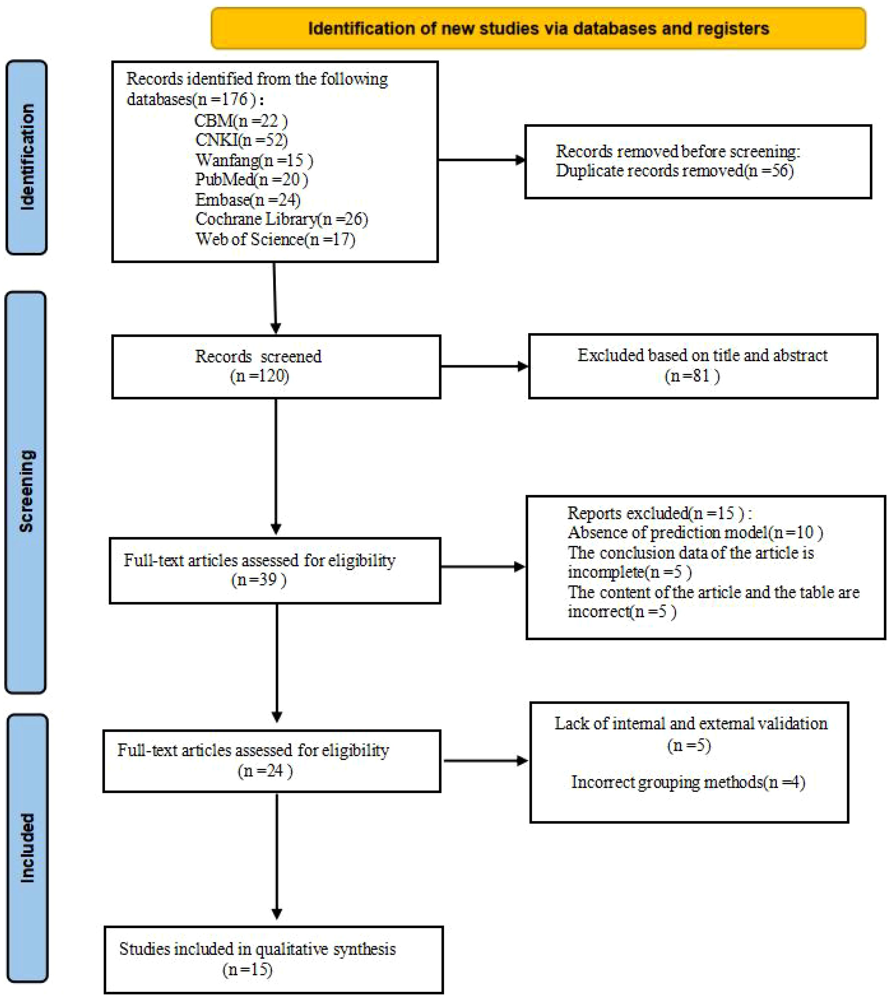 A total of 176 studies were identified through database retrieval. After removing 56 duplicate records, the titles and abstracts of the remaining studies were screened, and 81 studies were excluded. Subsequently, full-text evaluations were conducted on 39 articles. During this process, 15 studies were excluded due to the lack of a predictive model or incomplete data. Nine studies were excluded due to the lack of internal and external validation or improper grouping methods. Ultimately, 15 studies (1, 2, 4–6, 10, 11, 14, 15, 17, 18, 22, 23, 25, 29) and 24 models were included in this meta-analysis (Figure 1).