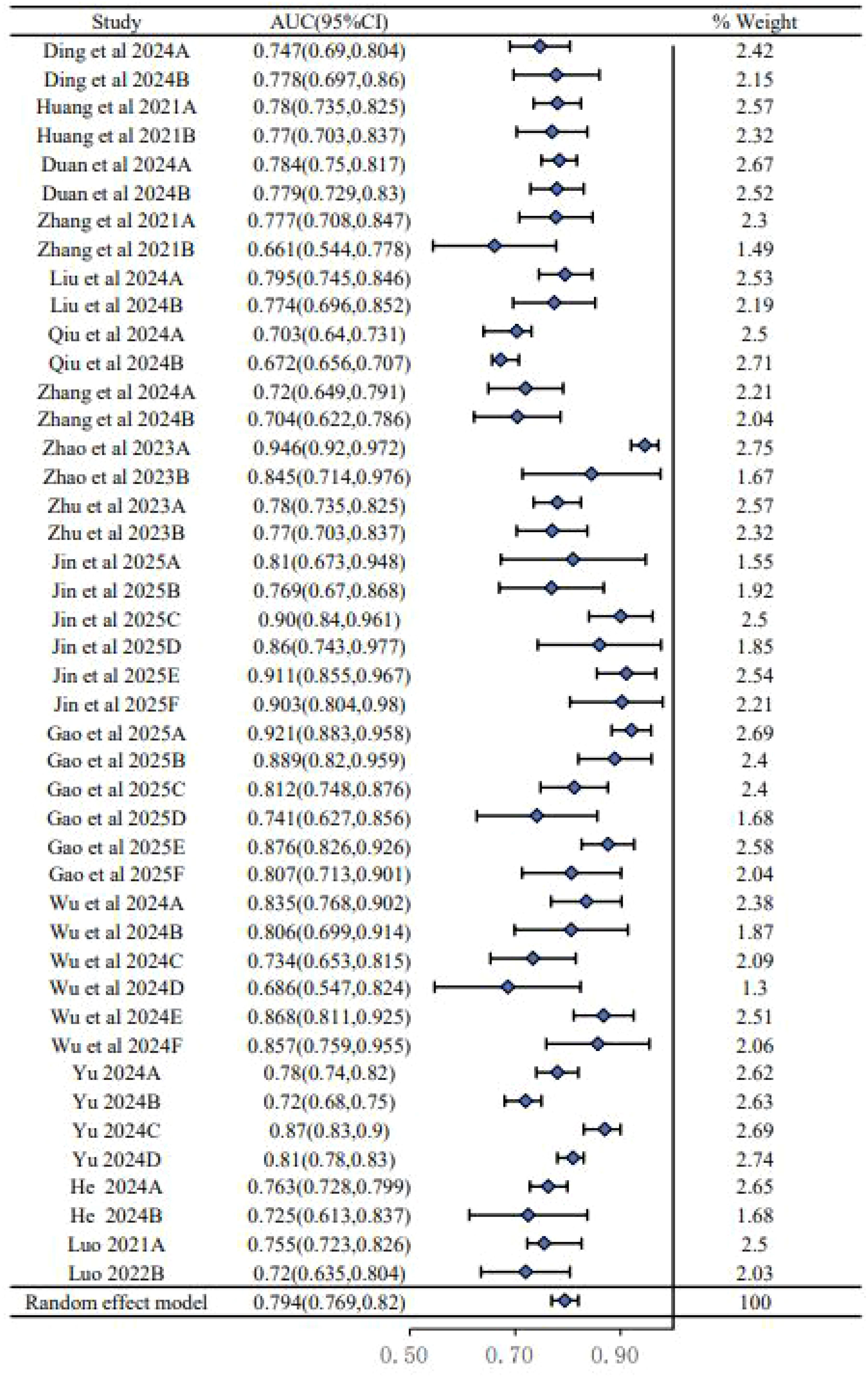 We conducted a meta-analysis of the AUC values from 24 models reported in the 15 included studies. As shown in the forest plot (Figure 2), there was substantial heterogeneity among the studies (I2 = 89.6%, P < 0.00001), necessitating the use of a random-effects model. This high level of heterogeneity suggests a significant variability in model performance across different study populations, predictor definitions, and modeling techniques. The pooled AUC was 0.794 (95% CI: 0.769–0.820), indicating moderate to good overall discriminatory performance, though this result must be interpreted with caution given the aforementioned heterogeneity and high risk of bias in the primary studies.