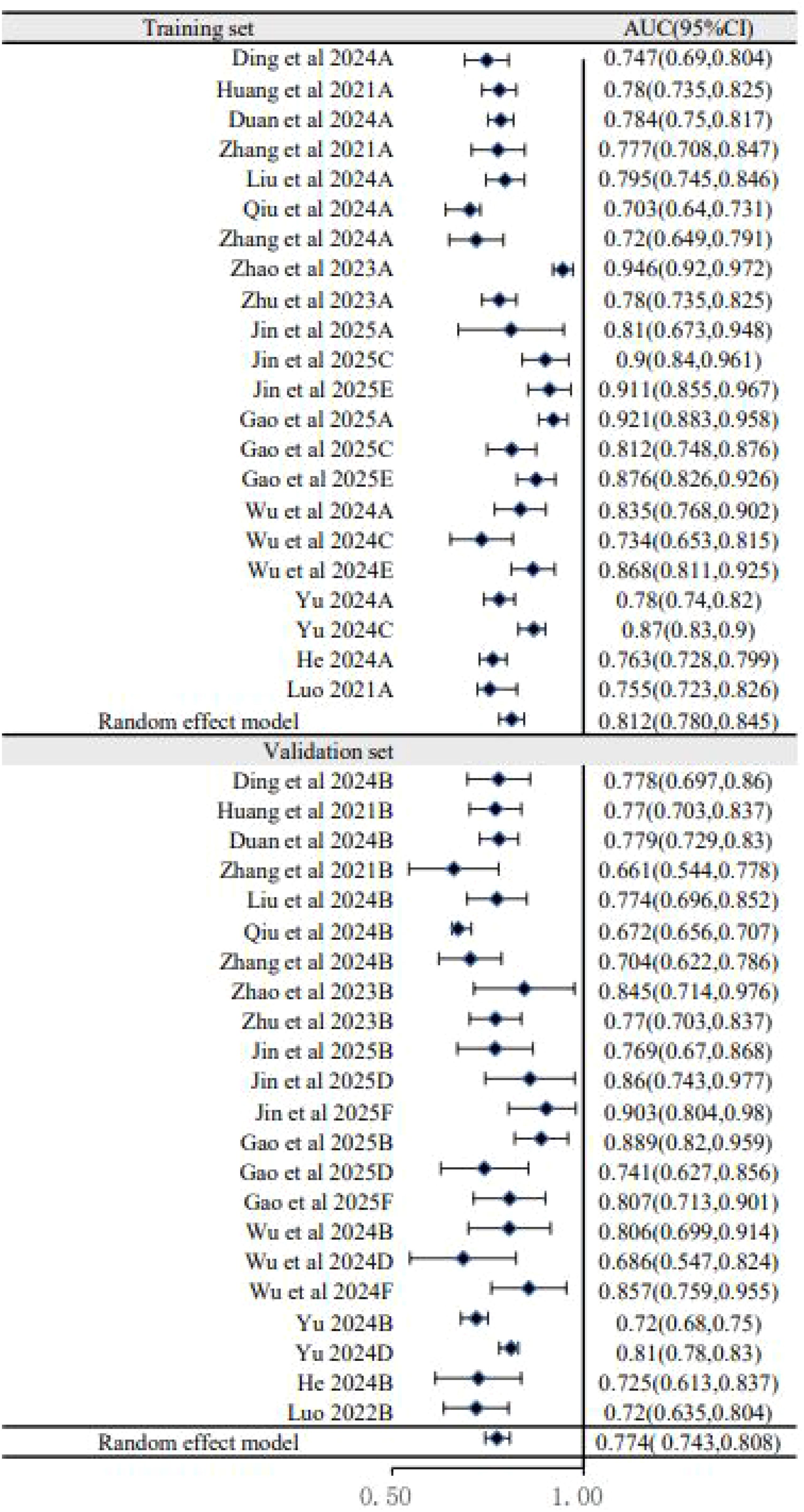 Results: A total of 15 studies, comprising 24 predictive models, were included. The pooled AUC was 0.794 (95% CI: 0.769–0.820), but with substantial heterogeneity (I2 = 89.6%). Subgroup analysis revealed a performance drop from the training set (pooled AUC, 0.812) to the validation set (pooled AUC, 0.774). The PROBAST assessment revealed that 12 of the 15 studies (80%) were critically at a high risk of bias, primarily due to flaws in participant selection.