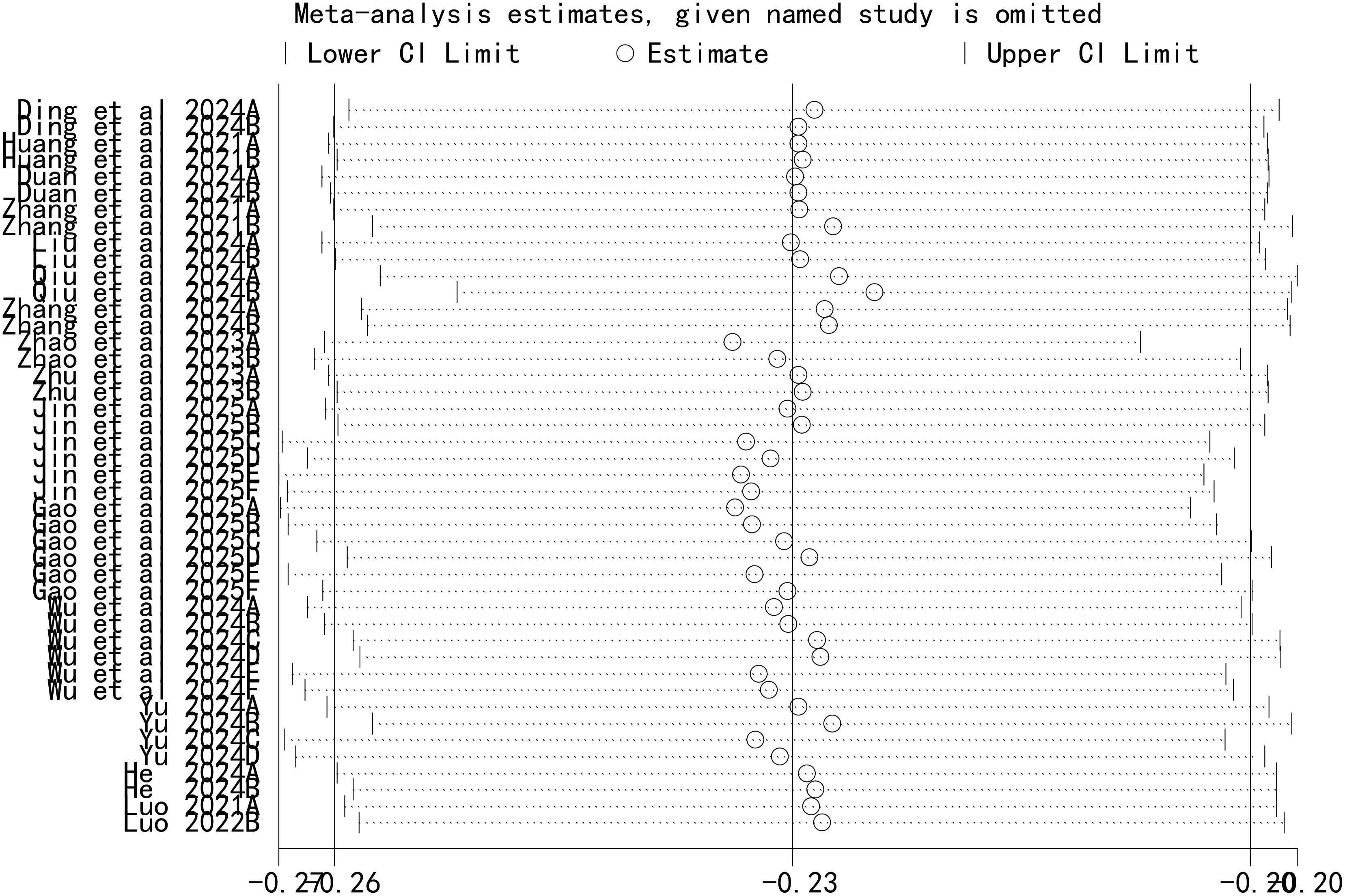 A leave-one-out sensitivity analysis was performed to assess the stability of our findings, with the results shown in Figure 5. This analysis demonstrated that the sequential removal of each individual study did not significantly alter the overall pooled AUC. This confirms that our meta-analysis results are robust and not unduly influenced by any single study.