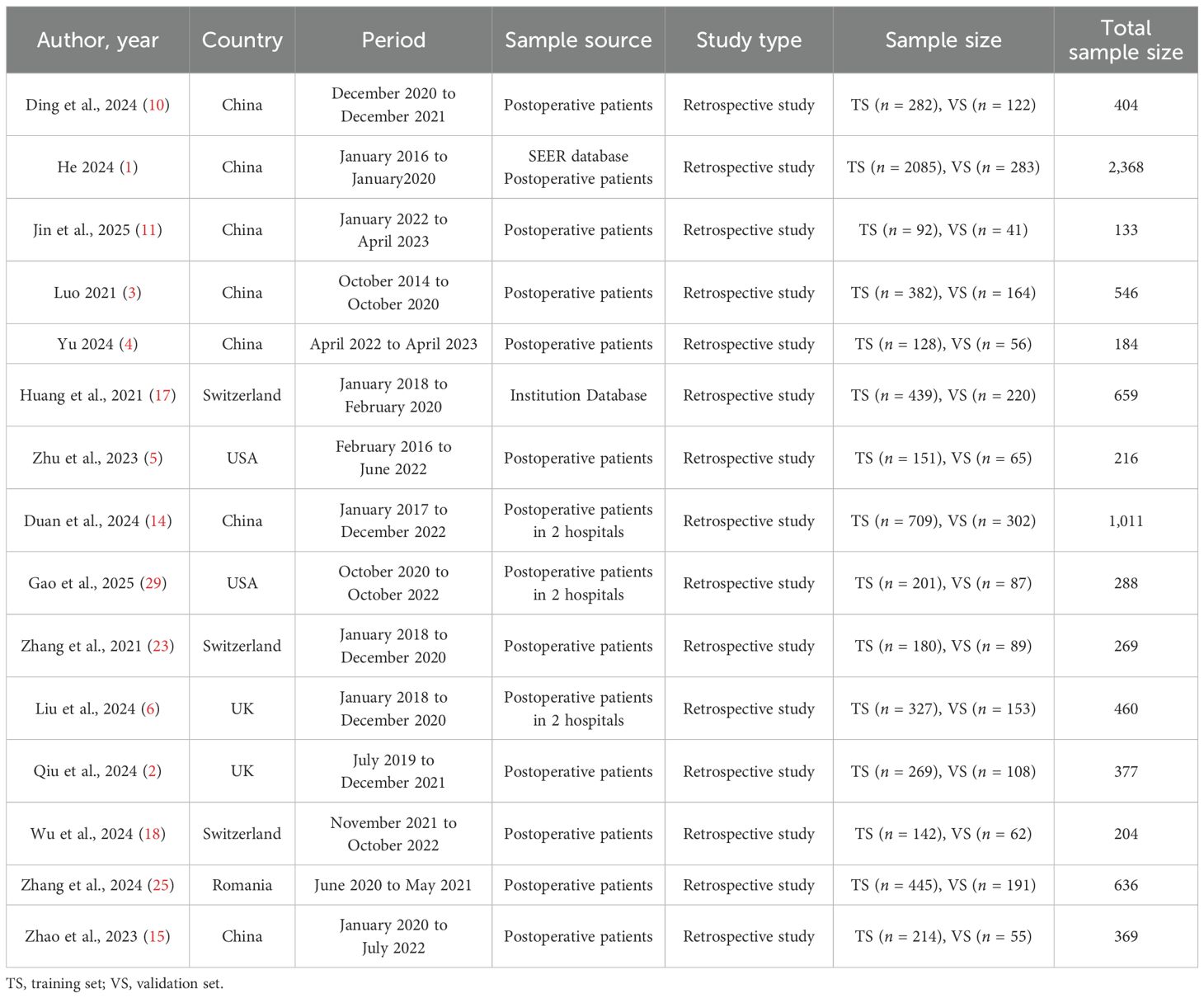 This meta-analysis included 15 retrospective studies published between 2021 and 2025, involving a total of 24 predictive models. As detailed in Table 1, the studies showed significant geographical diversity, with seven conducted in China and eight in Western countries. The total sample sizes varied considerably, ranging from 133 to 2,368 participants.