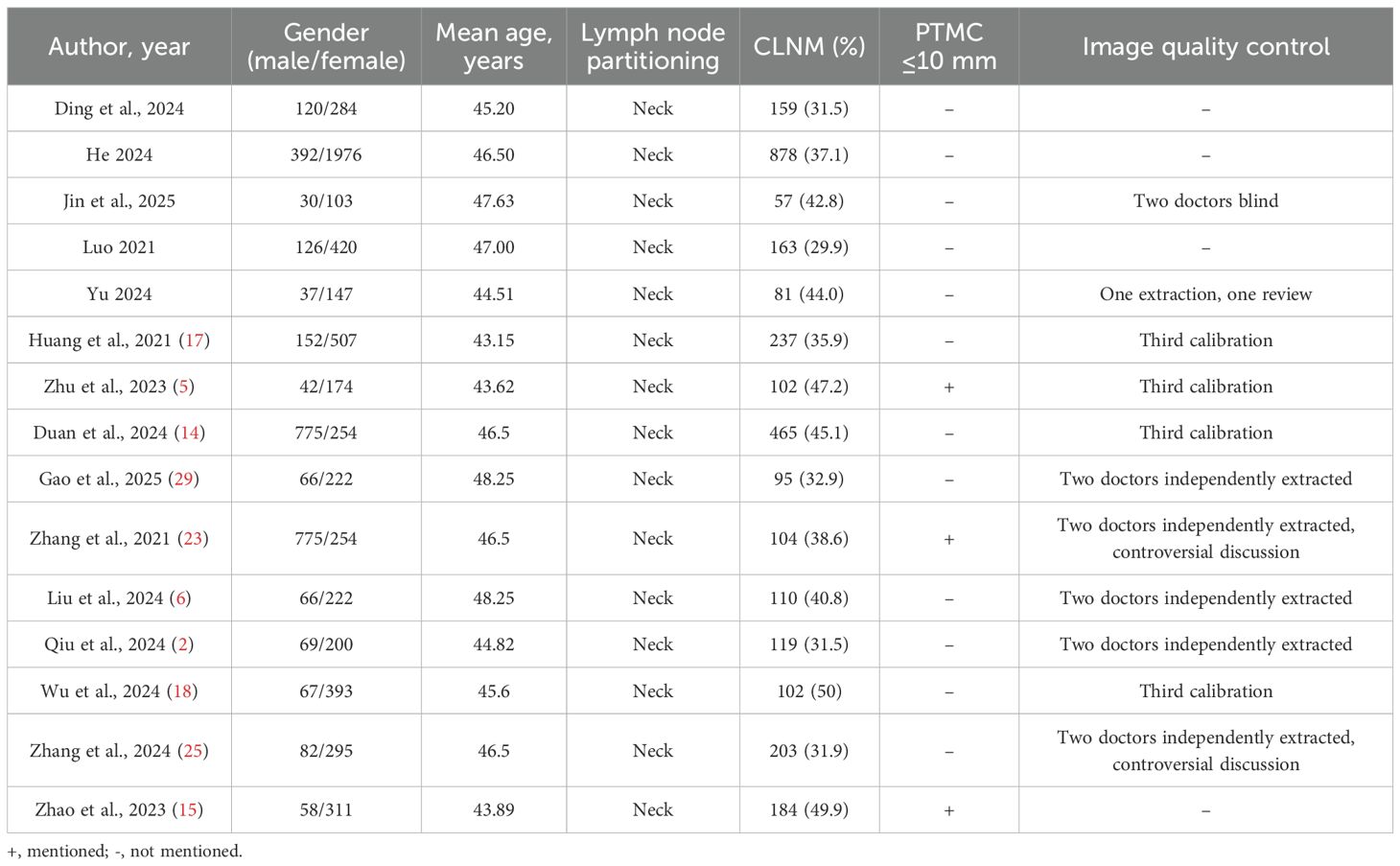 Further details on participant demographics are summarized in Table 2. The mean age of the patient cohorts was consistent across studies, ranging from 43 to 48 years. The reported rate of cervical lymph node metastasis (CLNM) was substantial, falling between 30% and 50%. A critically key methodological point highlighted in Table 2 is that only three studies explicitly confirmed that their population met the strict definition of PTMC (tumor diameter ≤10 mm), and quality control for ultrasound imaging was not reported in four of the studies.