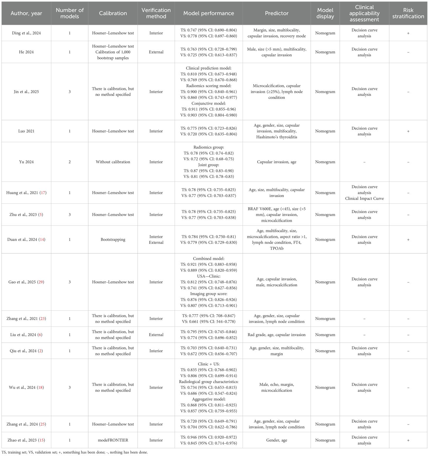 A detailed overview of the 24 prediction models is presented in Table 3. The performance of these models, as measured by the area under the curve (AUC), varied widely, with validation set AUCs ranging from a modest 0.661 to a highly discriminative 0.921. The predictors used to build these models were diverse but frequently included age, gender, tumor size, capsular invasion, and microcalcification. As shown in Table 3, while most models were presented as nomograms, their methodological follow-through varied. Although 14 studies reported some form of model calibration, the method was often unspecified. Furthermore, while 12 studies assessed clinical utility using decision curve analysis, only four attempted to define risk strata for clinical application, highlighting a common gap between model development and practical implementation.