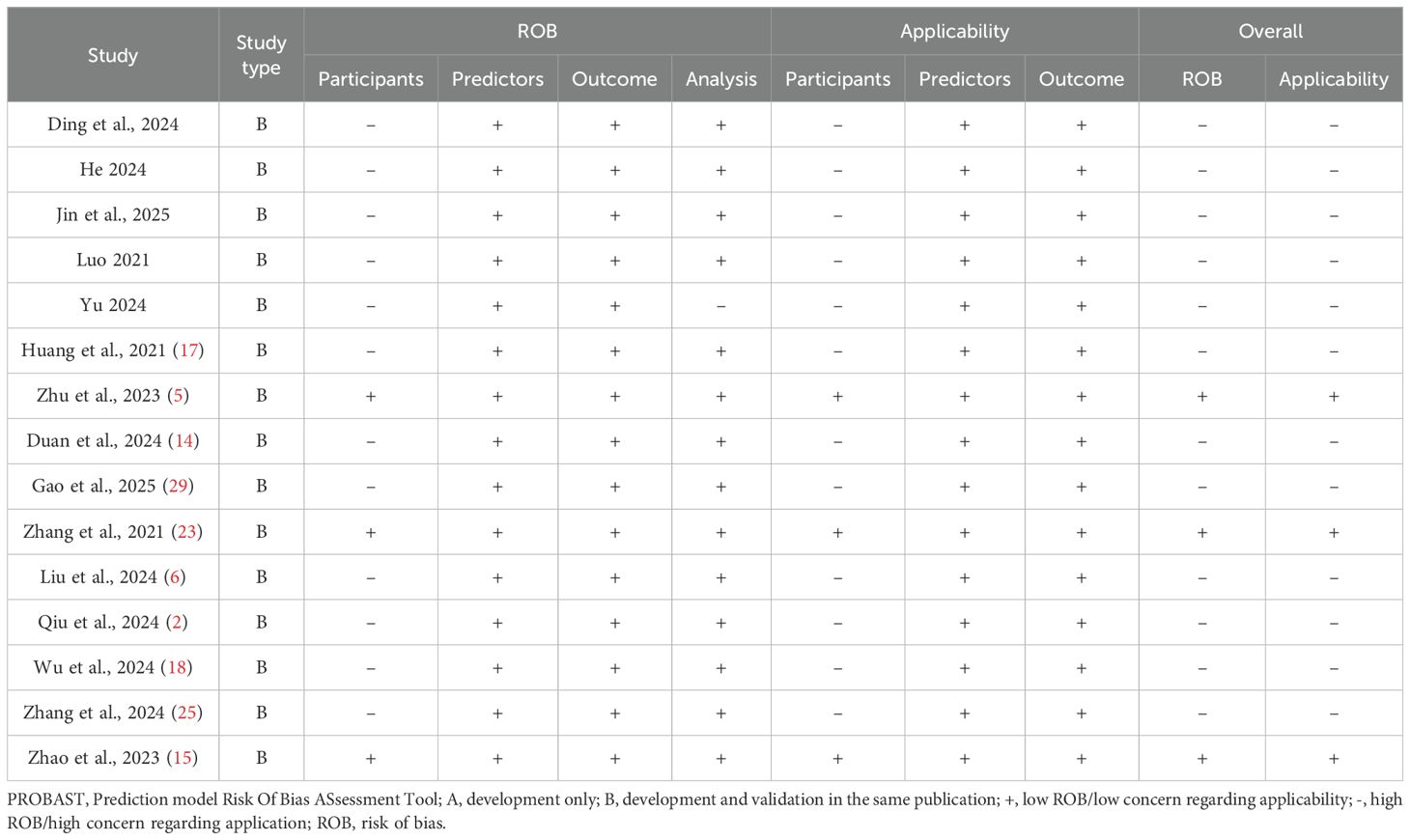 The risk of bias and suitability of the included studies were evaluated using the PROBAST checklist (27, 28). Two researchers independently assessed the risk of bias and applicability. The PROBAST checklist contains 20 signaling questions across four evaluation domains: participants, predictors, results, and analysis. The answer options for each signaling question are “yes”, “probably yes”, “no”, “probably no”, or “no information”. If the answer to any question in a certain field is “no” or “probably no”, that field is judged to have a high risk of bias. Only when all domains are determined to have a low risk of bias can the overall risk of bias be recognized as low.