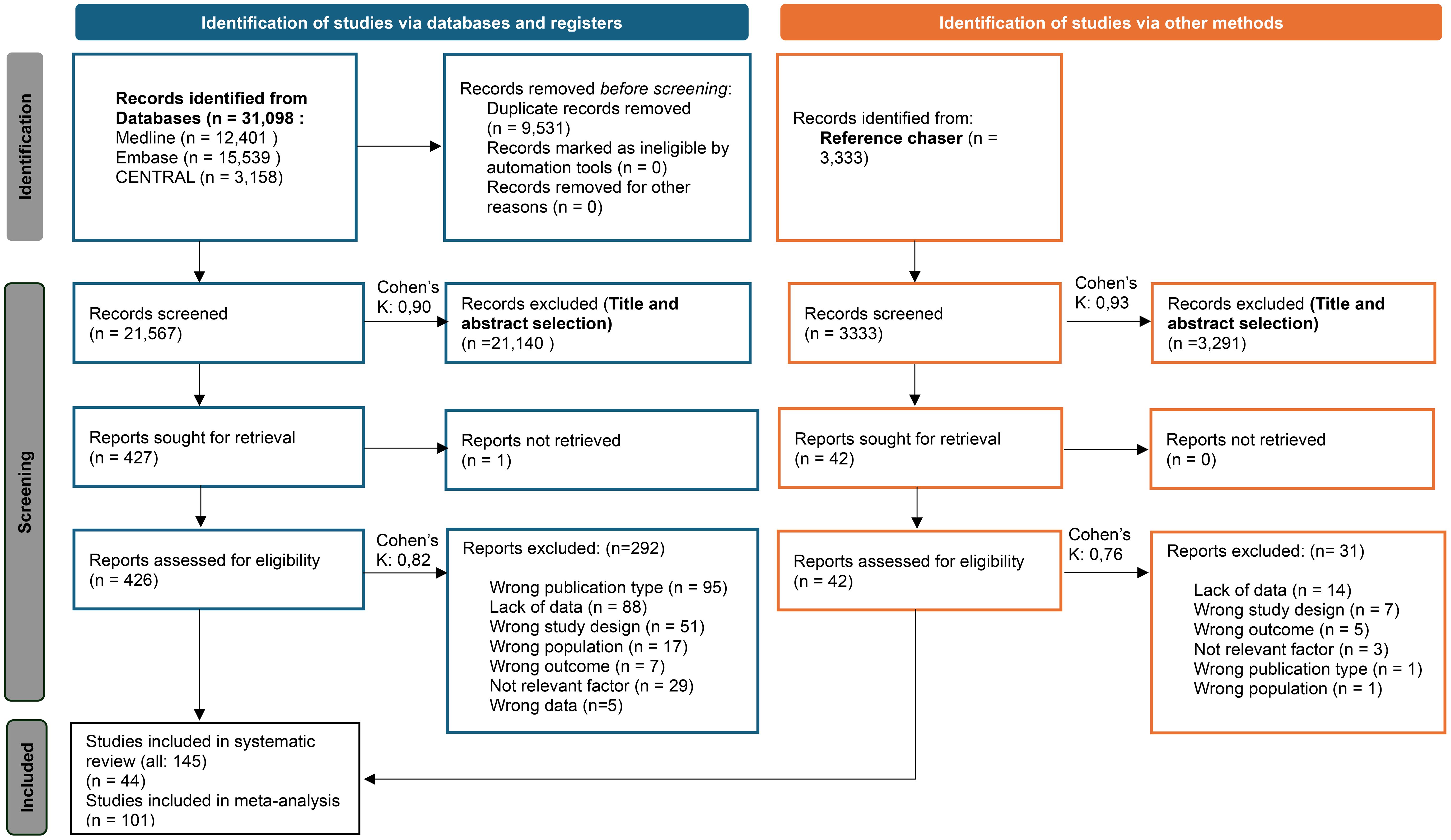 Altogether, 31,098 articles were identified by searching three databases. After the selection process and reference checking, we included 145 studies, but only 101 articles were eligible for quantitative analysis. Because of overlapping populations, insufficient data for statistical analysis, and lack of poolable categories, the other 44 articles were included in the systematic review section and/or were used in forest plots only for visualization purposes. In the case of overlapping populations, the larger population and more recent publications were preferred, as described in more detail in the Supplementary Materials (Methods S2).