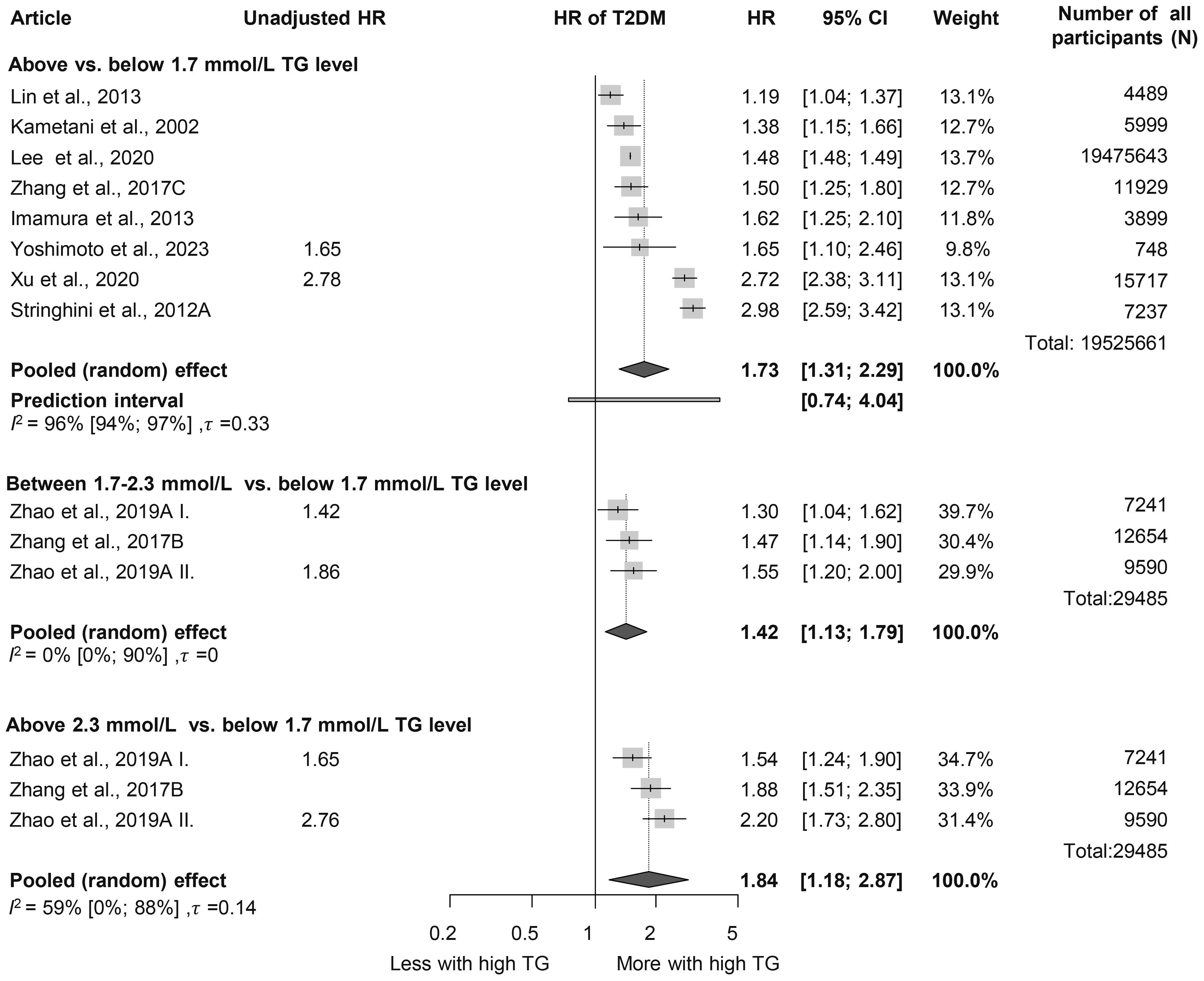 Results: We identified 31,098 articles and included 101 in our meta-analysis. We found that people with HTG had more than a 1.5-fold higher risk (HR: 1.73 [1.31; 2.29]) of developing T2DM. Those who had their TG levels between 1.7 and 2.3 mmol/L had a 42% higher risk (HR: 1.42 [1.13; 1.79]), while those with TG levels above 2.3 mmol/L had an even higher risk for T2DM (HR: 1.82 [1.18; 2.87]) compared with patients with TG levels below 1.7 mmol/L. When investigating the hypertriglyceridemic waist phenotype, we found that only those with increased waist circumference had a higher risk in both sex groups among the different phenotype groups (female: HR: 2.86 [1.59; 5.14], male: HR: 3.31 [1.57; 7.27]).