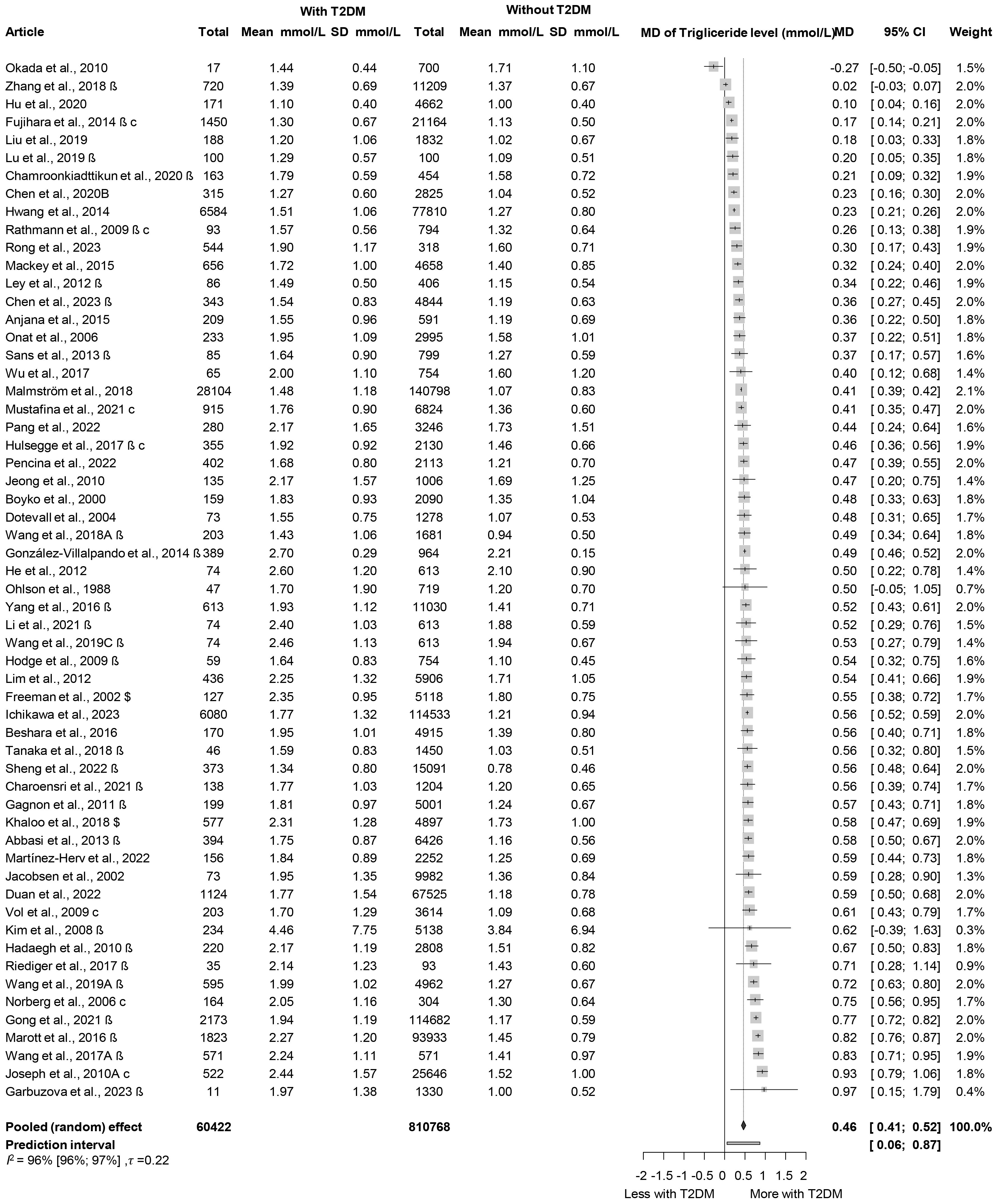 Figure 3. Mean differences (MD) in baseline TG levels, between patient groups with and without T2DM developed in the follow-up periods (MD, mean difference; TG, triglyceride; T2DM, type 2 diabetes mellitus; β, mean and SD are estimated mean and SD based on the quartiles in that study; c, male and female data from the same study were combined; $, mean and SD are estimated mean and SD based on the mean and SD given on the log scale variable in that study).