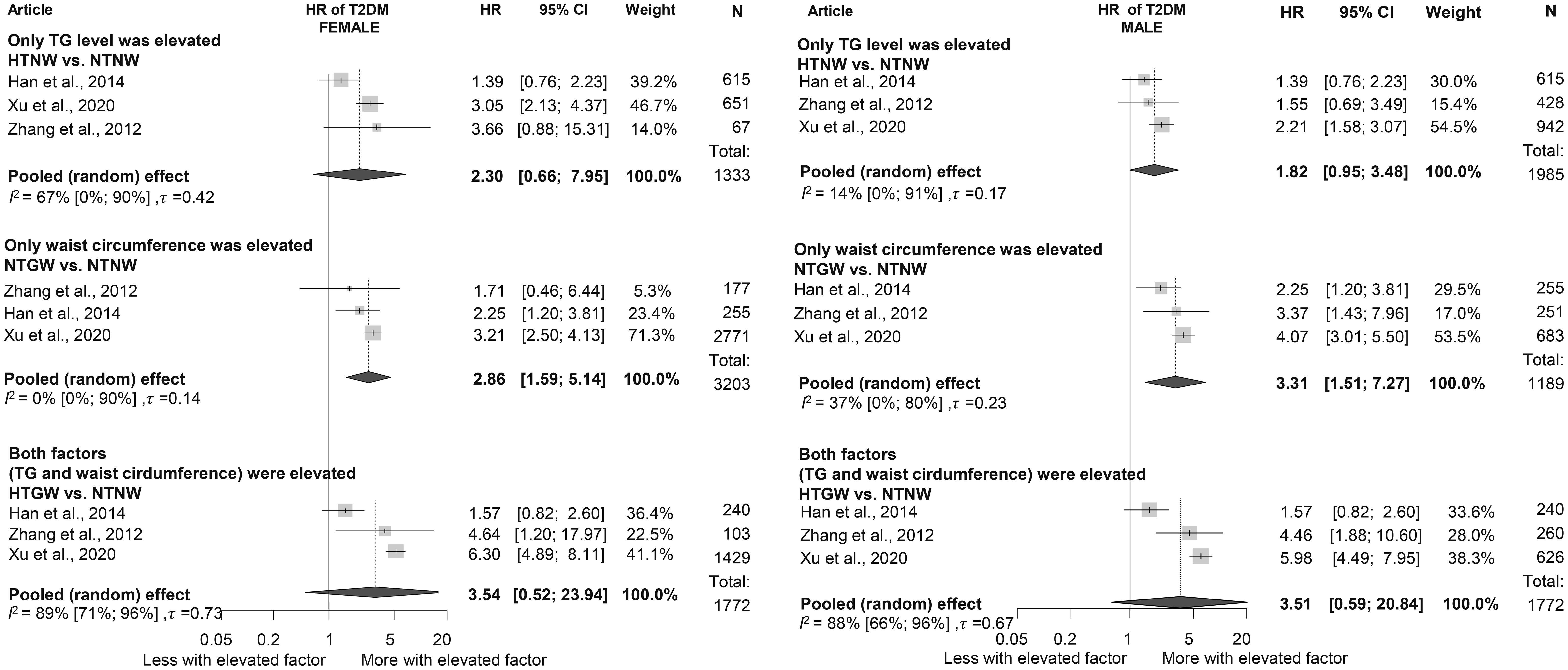 Figure 4. Hazard ratios for incident diabetes in groups with elevated triglyceride or/and waist circumference compared to neither elevated group [within hypertriglyceridemic waist (HTGW) phenotype groups], divided by sex (female/male); results of six separate analyses (HR, hazard ratios; TG, triglyceride; T2DM, type 2 diabetes mellitus; NTNW, normal triglyceride level and waist circumference; HTNW, elevated triglyceride level and normal waist circumference; NTGW, normal triglyceride level and elevated waist circumference; HTGW, elevated triglyceride level and waist circumference; N, number of men or women in that phenotype group).